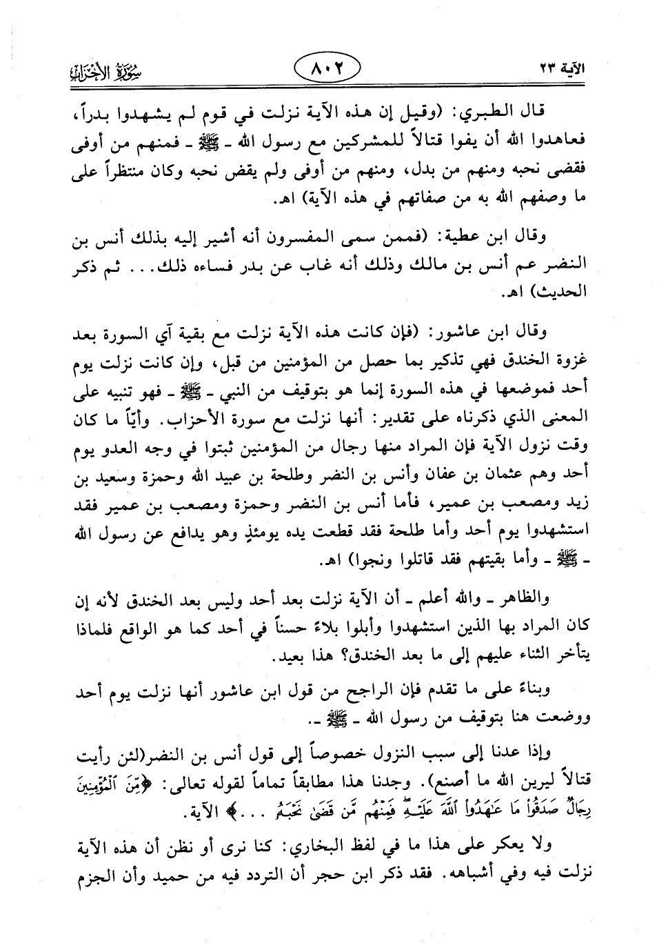 وإذا عدنا إلى سبب النزول خصوصًا إلى قول أنس بن النضر (لئن رأيت قتالاً ليرين الله ما أصنع). وجدنا هذا مطابقاً تماماً لقوله تعالى: (مِنَ الْمُؤْمِنِينَ رِجَالٌ صَدَقُوا مَا عَاهَدُوا اللَّهَ عَلَيْهِ فَمِنْهُمْ مَنْ قَضَى نَحْبَهُ ... ) الآية.