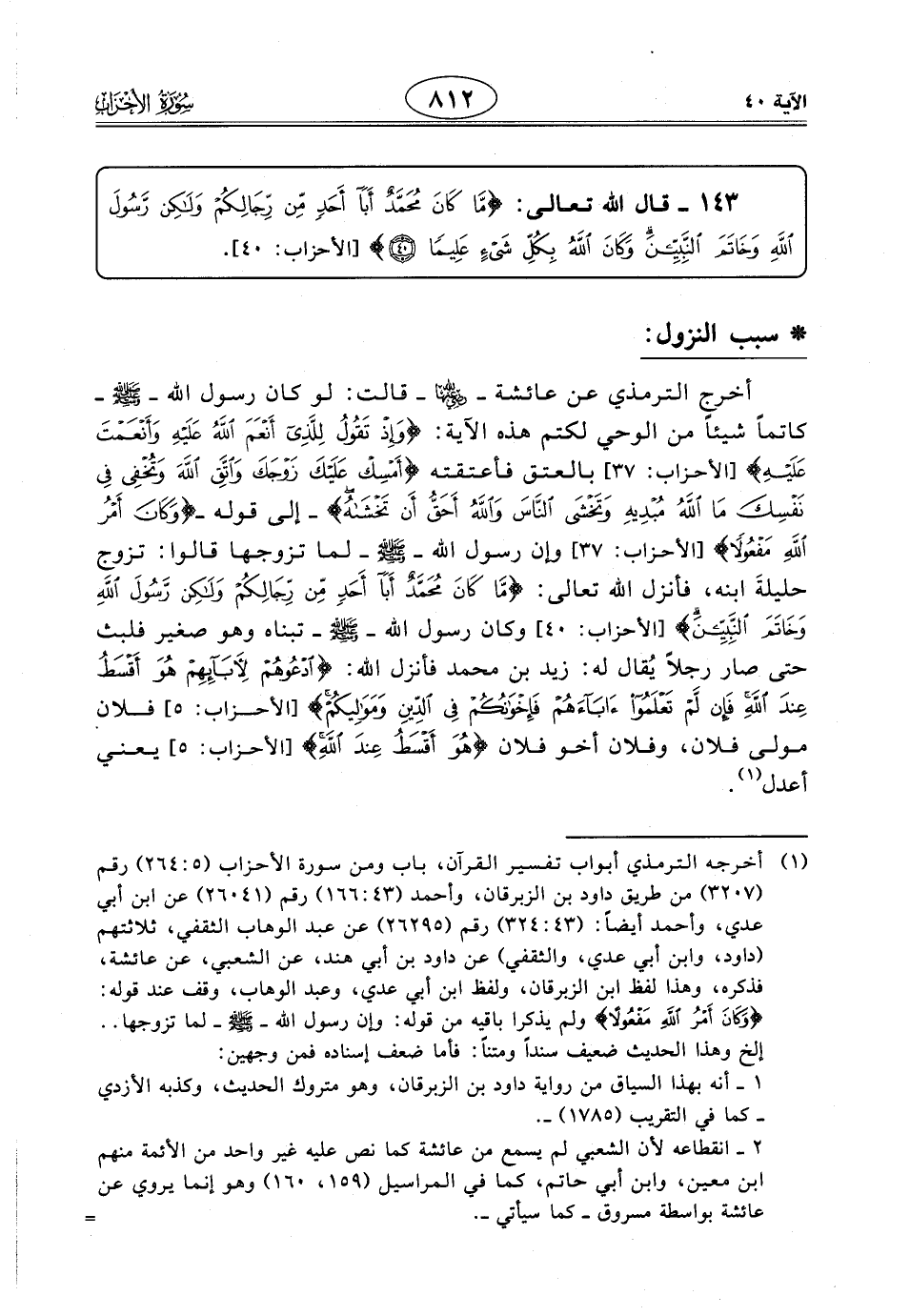 143 - قال اللَّه تعالى: (مَا كَانَ مُحَمَّدٌ أَبَا أَحَدٍ مِنْ رِجَالِكُمْ وَلَكِنْ رَسُولَ اللَّهِ وَخَاتَمَ النَّبِيِّينَ وَكَانَ اللَّهُ بِكُلِّ شَيْءٍ عَلِيمًا (40)