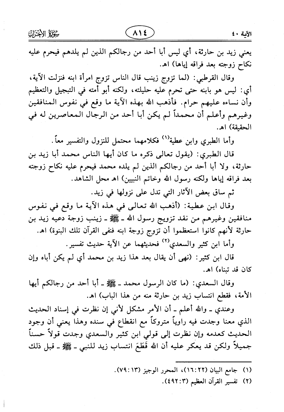 قال الطبري: (يقول تعالى ذكره ما كان أيها الناس محمد أبا زيد بن حارثة، ولا أبا أحد من رجالكم الذين لم يلده محمد فيحرم عليه نكاح زوجته بعد فراقه إياها ولكنه رسول الله وخاتم النبيين) اهـ محل الشاهد.