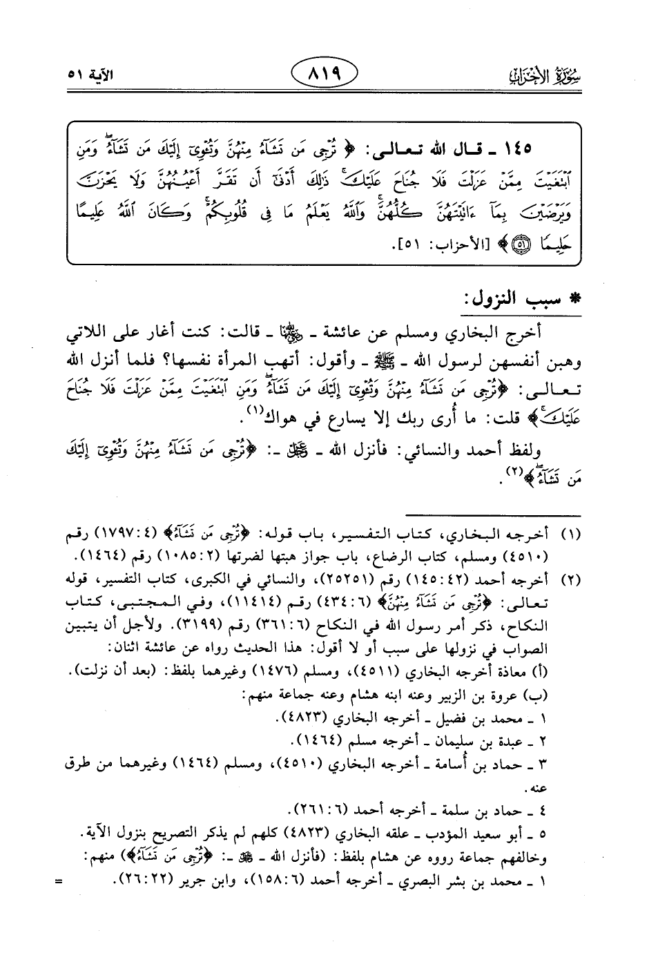 145 - قال الله تعالى: (تُرْجِي مَنْ تَشَاءُ مِنْهُنَّ وَتُؤْوِي إِلَيْكَ مَنْ تَشَاءُ وَمَنِ ابْتَغَيْتَ مِمَّنْ عَزَلْتَ فَلَا جُنَاحَ عَلَيْكَ ذَلِكَ أَدْنَى أَنْ تَقَرَّ أَعْيُنُهُنَّ وَلَا يَحْزَنَّ وَيَرْضَيْنَ بِمَا آتَيْتَهُنَّ كُلُّهُنَّ وَاللَّهُ يَعْلَمُ مَا فِي قُلُوبِكُمْ وَكَانَ اللَّهُ عَلِيمًا حَلِيمًا (51)