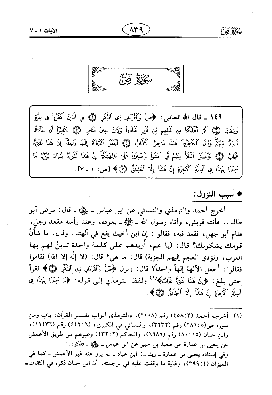 أخرج أحمد والترمذي والنَّسَائِي عن ابن عبَّاسٍ - رَضِيَ اللَّهُ عَنْهُمَا - قال: مرض أبو طالب، فأتته قريش، وأتاه رسول الله - صَلَّى اللَّهُ عَلَيْهِ وَسَلَّمَ - يعوده، وعند رأسه مقعد رجلٍ، فقام أبو جهل، فقعد فيه، فقالوا: إن ابن أخيك يقع في آلهتنا. وقال: ما شأنُ قومك يشكونك؟ قال: (يا عم، أُريدهم على كلمة واحدة تدينُ لهم بها العرب، وتؤدي العجم إليهم الجزية) قال: ما هي؟ قال: (لا إله إلا الله) فقاموا فقالوا: أَجعل الآلهة إلهاً واحداً؟ قال: ونزل (ص وَالْقُرْآنِ ذِي الذِّكْرِ) فقرأ حتى بلغ: (إِنَّ هَذَا لَشَيْءٌ عُجَابٌ) ولفظ الترمذي إلى قوله: (مَا سَمِعْنَا بِهَذَا فِي الْمِلَّةِ الْآخِرَةِ إِنْ هَذَا إِلَّا اخْتِلَاقٌ).