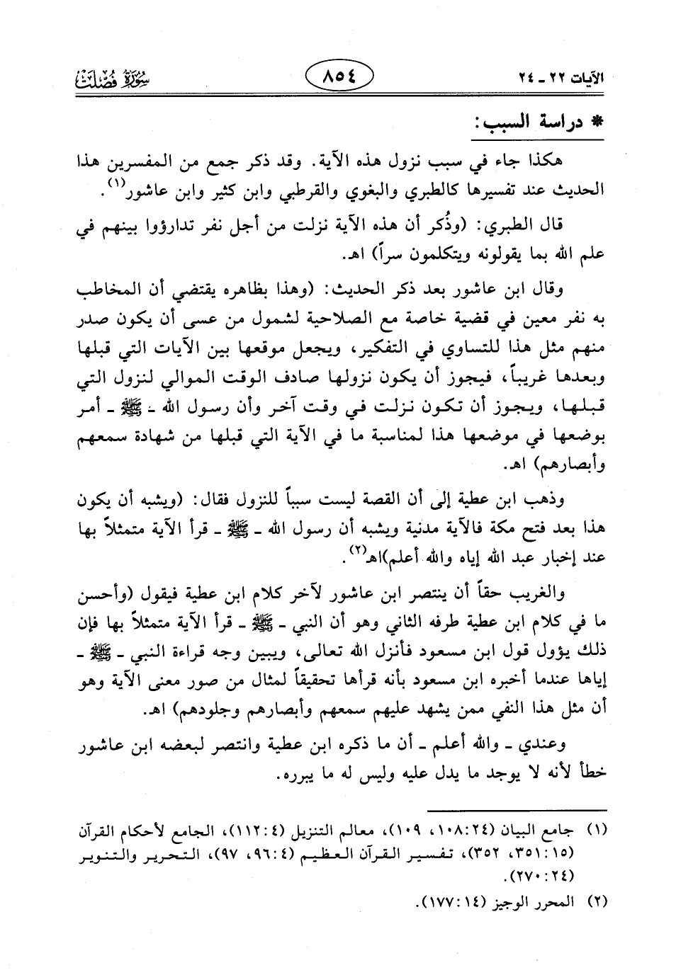 وقال ابن عاشور بعد ذكر الحديث: (وهذا بظاهره يقتضي أن المخاطب به نفر معين في قضية خاصة مع الصلاحية لشمول من عسى أن يكون صدر منهم مثل هذا للتساوي في التفكير، ويجعل موقعها بين الآيات التي قبلها وبعدها غريباً، فيجوز أن يكون نزولها صادف الوقت الموالي لنزول التي قبلها، ويجوز أن تكون نزلت في وقت آخر وأن رسول الله - صَلَّى اللَّهُ عَلَيْهِ وَسَلَّمَ - أمر بوضعها في موضعها هذا لمناسبة ما في الآية التي قبلها من شهادة سمعهم وأبصارهم) اهـ.