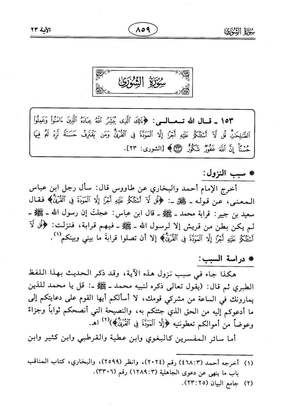 أخرج الإمام أحمد والبخاري عن طاووس قال: سأل رجل ابن عبَّاسٍ المعنى، عن قوله - عَزَّ وَجَلَّ -: (قُلْ لَا أَسْأَلُكُمْ عَلَيْهِ أَجْرًا إِلَّا الْمَوَدَّةَ فِي الْقُرْبَى) فقال سعيد بن جبير: قرابة محمد - صَلَّى اللَّهُ عَلَيْهِ وَسَلَّمَ - قال ابن عبَّاسٍ: عجلتَ إن رسول الله - صَلَّى اللَّهُ عَلَيْهِ وَسَلَّمَ - لم يكن بطن من قريش إلا لرسول اللَّه - صَلَّى اللَّهُ عَلَيْهِ وَسَلَّمَ - فيهم قرابة، فنزلت: (قُلْ لَا أَسْأَلُكُمْ عَلَيْهِ أَجْرًا إِلَّا الْمَوَدَّةَ فِي الْقُرْبَى) إلا أن تصلوا قرابةَ ما بيني وبينكم.
