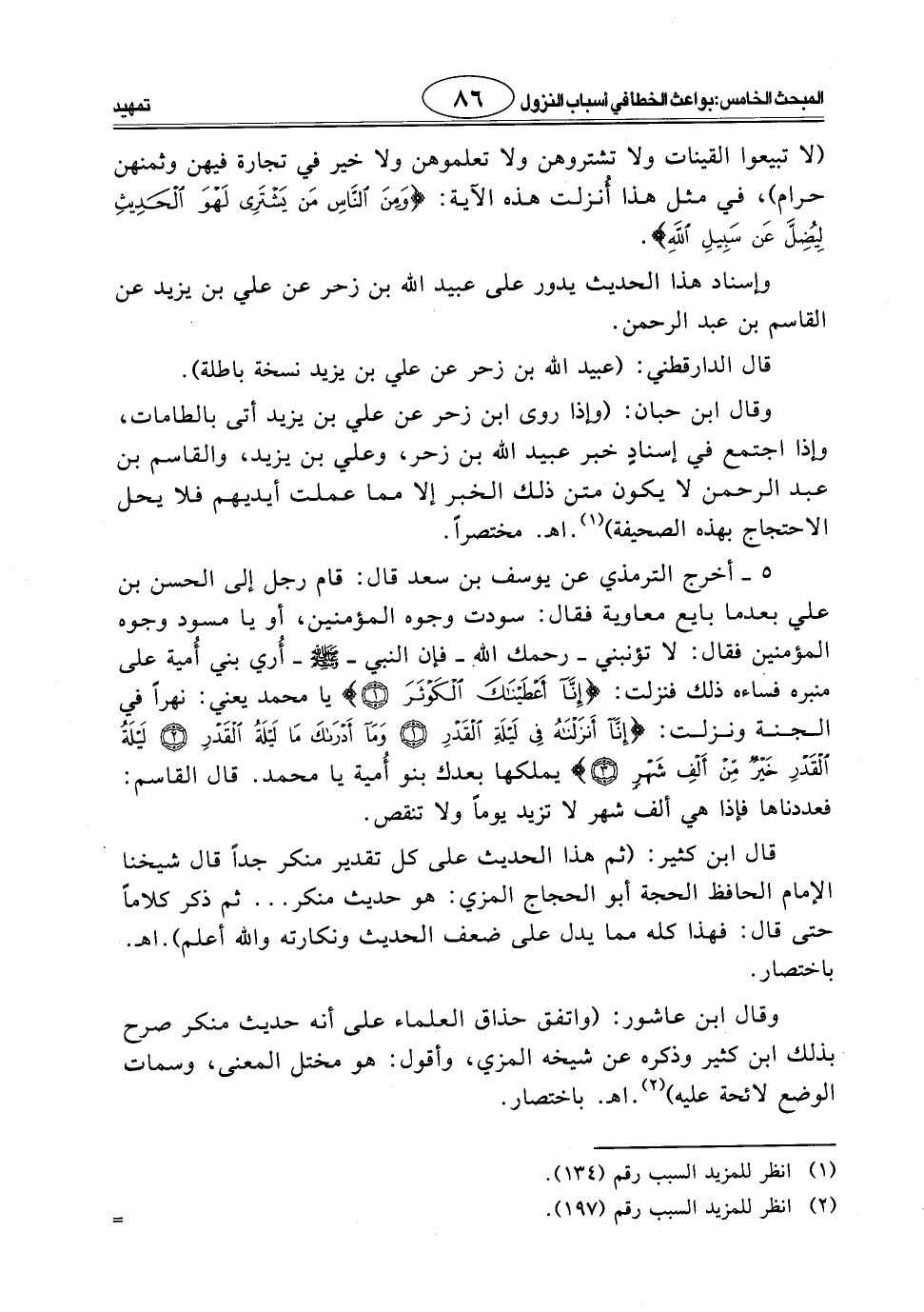 5 - أخرج الترمذي عن يوسف بن سعد قال: قام رجل إلى الحسن بن علي بعدما بايع معاوية فقال: سودت وجوه المؤمنين، أو يا مسود وجوه المؤمنين فقال: لا تؤنبني - رحمك اللَّه - فإن النبي - صَلَّى اللَّهُ عَلَيْهِ وَسَلَّمَ - أُري بني أُمية على منبره فساءه ذلك فنزلت: (إِنَّا أَعْطَيْنَاكَ الْكَوْثَرَ) يا محمد يعني: نهرًا في الجنة ونزلت: إِنَّا أَنْزَلْنَاهُ فِي لَيْلَةِ الْقَدْرِ (1) وَمَا أَدْرَاكَ مَا لَيْلَةُ الْقَدْرِ (2) لَيْلَةُ الْقَدْرِ خَيْرٌ مِنْ أَلْفِ شَهْرٍ (3)، يملكها بعدك بنو أُمية يا محمد. قال القاسم: فعددناها فإذا هي ألف شهر لا تزيد يومًا ولا تنقص.