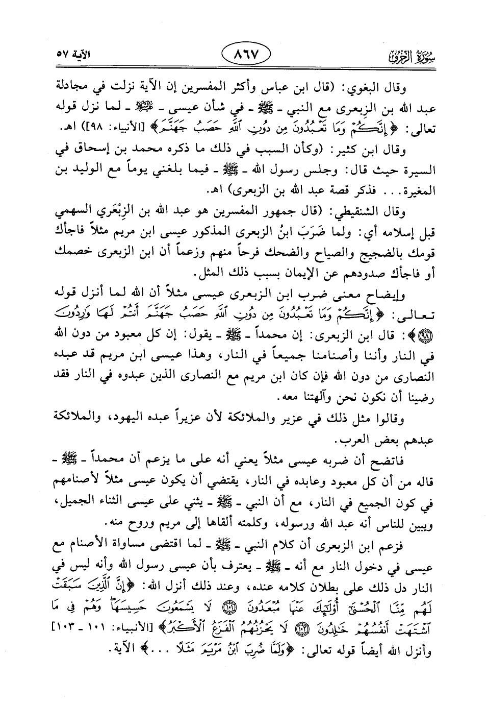 وقال البغوي: (قال ابن عبَّاسٍ وأكثر المفسرين إن الآية نزلت في مجادلة عبد اللَّه بن الزِبعرى مع النبي - صَلَّى اللَّهُ عَلَيْهِ وَسَلَّمَ - في شأن عيسى - عليه السلام - لما نزل قوله تعالى: (إِنَّكُمْ وَمَا تَعْبُدُونَ مِنْ دُونِ اللَّهِ حَصَبُ جَهَنَّمَ) اهـ.