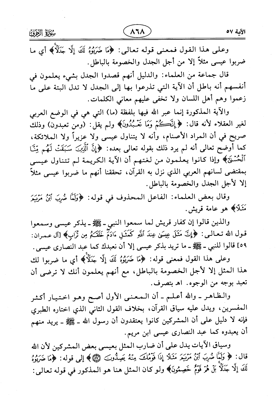 والآية المذكورة إنما عبر الله فيها بلفظة (ما) التي هي في الوضع العربي لغير العقلاء لأنه قال: (إِنَّكُمْ وَمَا تَعْبُدُونَ) ولم يقل: (ومَن تعبدون) وذلك صريح في أن المراد الأصنام، وأنه لا يتناول عيسى ولا عزيرًا ولا الملائكة، كما أوضح تعالى أنه لم يرد ذلك بقوله تعالى بعده: (إِنَّ الَّذِينَ سَبَقَتْ لَهُمْ مِنَّا الْحُسْنَى) وإذا كانوا يعلمون من لغتهم أن الآية الكريمة لم تتناول عيسى بمقتضى لسانهم العربي الذي نزل به القرآن، تحققنا أنهم ما ضربوا عيسى مثلاً إلا لأجل الجدل والخصومة بالباطل.