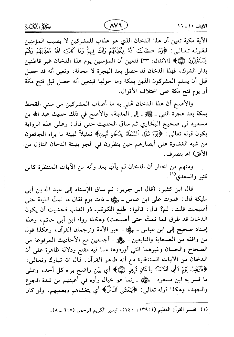 قال ابن كثير: (قال ابن جرير: ثم ساق الإسناد إلى عبد الله بن أبي مليكة قال: غدوت على ابن عبَّاسٍ - رَضِيَ اللَّهُ عَنْهُمَا - ذات يوم فقال ما نمتُ الليلة حتى أصبحت قلت: لم؟ قال: قالوا: طلع الكوكب ذو الذنب فخشيت أن يكون الدخان قد طرق فما نمتُ حتى أصبحت) وهكذا رواه ابن أبي حاتم، وهذا إسناد صحيح إلى ابن عبَّاسٍ - رَضِيَ اللَّهُ عَنْهُمَا - حبر الأمة وترجمان القرآن، وهكذا قول من وافقه من الصحابة والتابعين - رَضِيَ اللَّهُ عَنْهُمْ - أجمعين مع الأحاديث المرفوعة من الصحاح والحسان وغيرهما التي أوردوها مما فيه مقنع ودلالة ظاهرة على أن الدخان من الآيات المنتظرة مع أنه ظاهر القرآن. قال الله تبارك وتعالى: (فَارْتَقِبْ يَوْمَ تَأْتِي السَّمَاءُ بِدُخَانٍ مُبِينٍ) أي بيّن واضح يراه كل أحد، وعلى ما فسر به ابن مسعود - رَضِيَ اللَّهُ عَنْهُ - إنما هو خيال رأوه في أعينهم من شدة الجوع والجهد، وهكذا قوله تعالى: (يَغْشَى النَّاسَ) أي يتغشاهم ويعميهم، ولو كان
