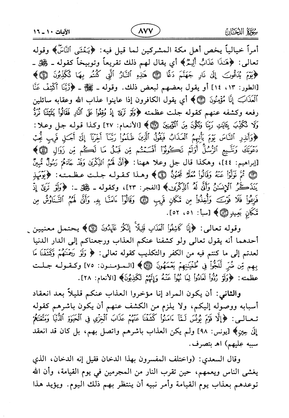 وقال السعدي: (واختلف المفسرون بهذا الدخان فقيل إنه الدخان، الذي يغشى الناس ويعمهم، حين تقرب النار من المجرمين في يوم القيامة، وأن الله توعدهم بعذاب يوم القيامة وأمر نبيه أن ينتظر بهم ذلك اليوم. ويؤيد هذا