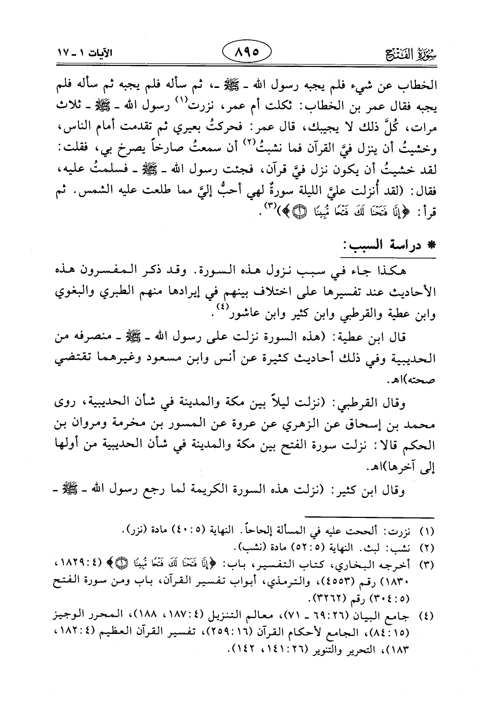 قال ابن عطية: (هذه السورة نزلت على رسول الله - صَلَّى اللَّهُ عَلَيْهِ وَسَلَّمَ - منصرفه من الحديبية وفي ذلك أحاديث كثيرة عن أنس وابن مسعود وغيرهما تقتضي صحته) اهـ.