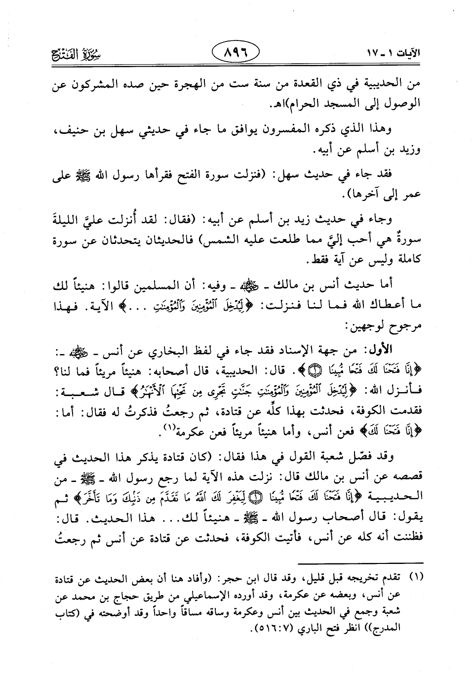 الأول: من جهة الإسناد فقد جاء في لفظ البخاري عن أنس - رَضِيَ اللَّهُ عَنْهُ -: (إِنَّا فَتَحْنَا لَكَ فَتْحًا مُبِينًا). قال: الحديبية، قال أصحابه: هنيئًا مريئًا فما لنا؟ فأنزل الله: (لِيُدْخِلَ الْمُؤْمِنِينَ وَالْمُؤْمِنَاتِ جَنَّاتٍ تَجْرِي مِنْ تَحْتِهَا الْأَنْهَارُ) قال شعبة: فقدمت الكوفة، فحدثت بهذا كلِّه عن قتادة، ثم رجعتُ فذكرتُ له فقال: أما: (إِنَّا فَتَحْنَا لَكَ) فعن أنس، وأما هنيئًا مريئًا فعن عكرمة.