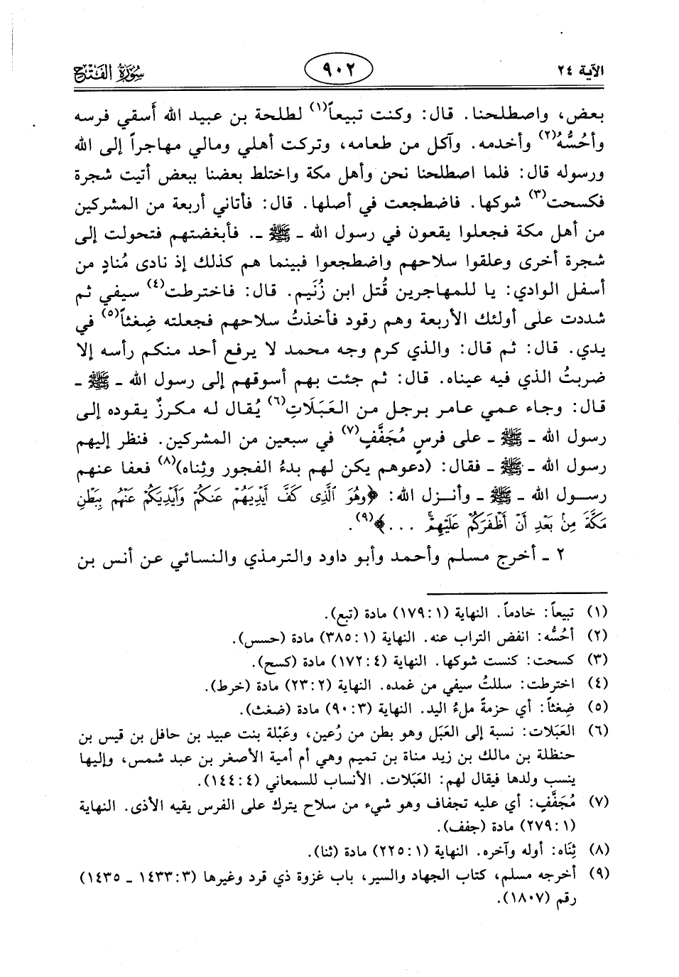 بعض، واصطلحنا. قال: وكنت تبيعًا لطلحة بن عبيد الله أَسقي فرسه وأحُسُّهُ وأخدمه. وآكل من طعامه، وتركت أهلي ومالي مهاجرًا إلى الله ورسوله قال: فلما اصطلحنا نحن وأهل مكة واختلط بعضنا ببعض أتيت شجرة فكسحت شوكها. فاضطجعت في أصلها. قال: فأتاني أربعة من المشركين من أهل مكة فجعلوا يقعون في رسول الله - صَلَّى اللَّهُ عَلَيْهِ وَسَلَّمَ -. فأبغضتهم فتحولت إلى شجرة أخرى وعلقوا سلاحهم واضطجعوا فبينما هم كذلك إذ نادى مُنادٍ من أسفل الوادي: يا للمهاجرين قُتل ابن زُنَيم. قال: فاخترطت سيفي ثم شددت على أولئك الأربعة وهم رقود فأخذتُ سلاحهم فجعلته ضِغثًا في يدي. قال: ثم قال: والذي كرم وجه محمد لا يرفع أحد منكم رأسه إلا ضربتُ الذي فيه عيناه. قال: ثم جئت بهم أسوقهم إلى رسول اللَّه - صَلَّى اللَّهُ عَلَيْهِ وَسَلَّمَ - قال: وجاء عمي عامر برجل من العَبَلَاتِ يُقال له مكرزٌ يقوده إلى رسول اللَّه - صَلَّى اللَّهُ عَلَيْهِ وَسَلَّمَ - على فرسٍ مُجَفَّفٍ في سبعين من المشركين. فنظر إليهم رسول الله - صَلَّى اللَّهُ عَلَيْهِ وَسَلَّمَ - فقال: (دعوهم يكن لهم بدءُ الفجور وثناه) فعفا عنهم رسول الله - صَلَّى اللَّهُ عَلَيْهِ وَسَلَّمَ - وأنزل الله: (وَهُوَ الَّذِي كَفَّ أَيْدِيَهُمْ عَنْكُمْ وَأَيْدِيَكُمْ عَنْهُمْ بِبَطْنِ مَكَّةَ مِنْ بَعْدِ أَنْ أَظْفَرَكُمْ عَلَيْهِمْ ... ).
