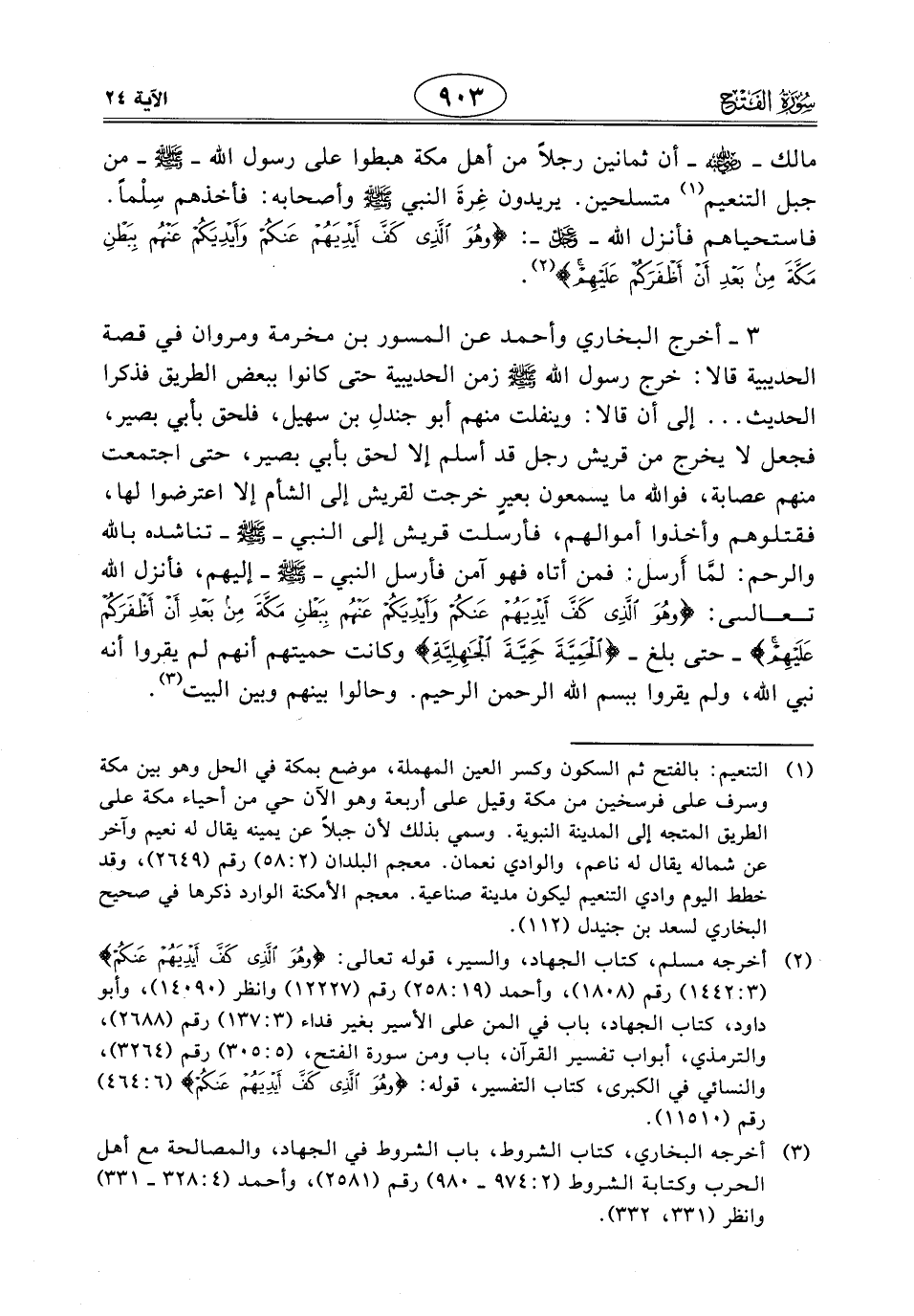 مالك - رَضِيَ اللَّهُ عَنْهُ - أن ثمانين رجلاً من أهل مكة هبطوا على رسول الله - صَلَّى اللَّهُ عَلَيْهِ وَسَلَّمَ - من جبل التنعيم متسلحين. يريدون غِرةَ النبي - صَلَّى اللَّهُ عَلَيْهِ وَسَلَّمَ - وأصحابه: فأخذهم سِلْماً. فاستحياهم فأنزل اللَّه - عَزَّ وَجَلَّ -: (وَهُوَ الَّذِي كَفَّ أَيْدِيَهُمْ عَنْكُمْ وَأَيْدِيَكُمْ عَنْهُمْ بِبَطْنِ مَكَّةَ مِنْ بَعْدِ أَنْ أَظْفَرَكُمْ عَلَيْهِمْ).