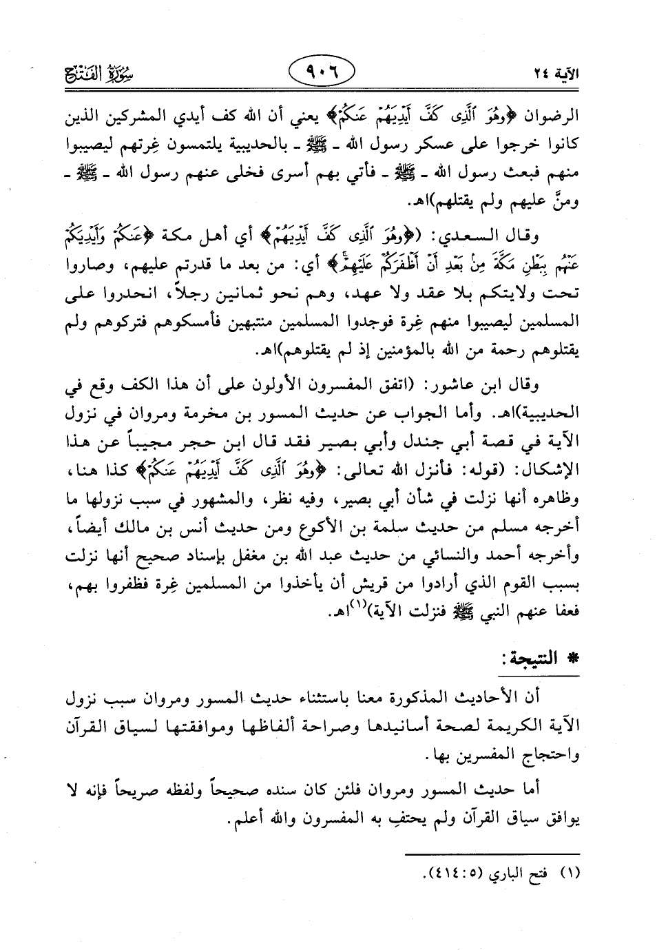 وقال ابن عاشور: (اتفق المفسرون الأولون على أن هذا الكف وقع في الحديبية). اهـ. وأما الجواب عن حديث المسور بن مخرمة ومروان في نزول الآية في قصة أبي جندل وأبي بصير فقد قال ابن حجر مجيباً عن هذا الإشكال: (قوله: فأنزل الله تعالى: (وَهُوَ الَّذِي كَفَّ أَيْدِيَهُمْ عَنْكُمْ) كذا هنا، وظاهره أنها نزلت في شأن أبي بصير، وفيه نظر، والمشهور في سبب نزولها ما أخرجه مسلم من حديث سلمة بن الأكوع ومن حديث أنس بن مالك أيضاً، وأخرجه أحمد والنَّسَائِي من حديث عبد الله بن مغفل بإسناد صحيح أنها نزلت بسبب القوم الذي أرادوا من قريش أن يأخذوا من المسلمين غِرة فظفروا بهم، فعفا عنهم النبي - صَلَّى اللَّهُ عَلَيْهِ وَسَلَّمَ - فنزلت الآية) اهـ.