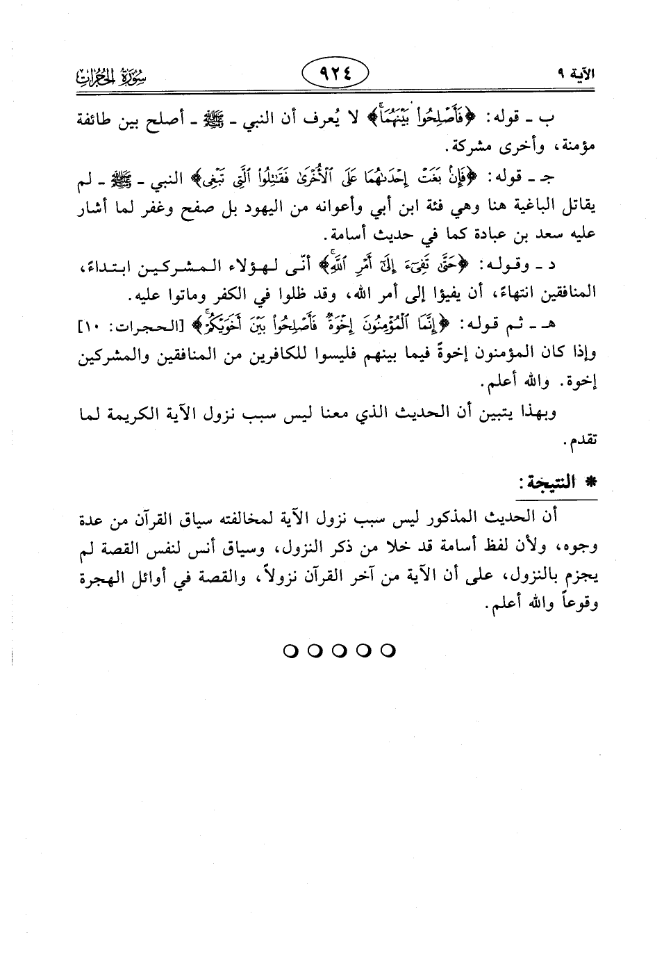 جـ - قوله: (فَإِنْ بَغَتْ إِحْدَاهُمَا عَلَى الْأُخْرَى فَقَاتِلُوا الَّتِي تَبْغِي) النبي - صَلَّى اللَّهُ عَلَيْهِ وَسَلَّمَ - لم يقاتل الباغية هنا وهي فئة ابن أبي وأعوانه من اليهود بل صفح وغفر لما أشار عليه سعد بن عبادة كما في حديث أسامة.