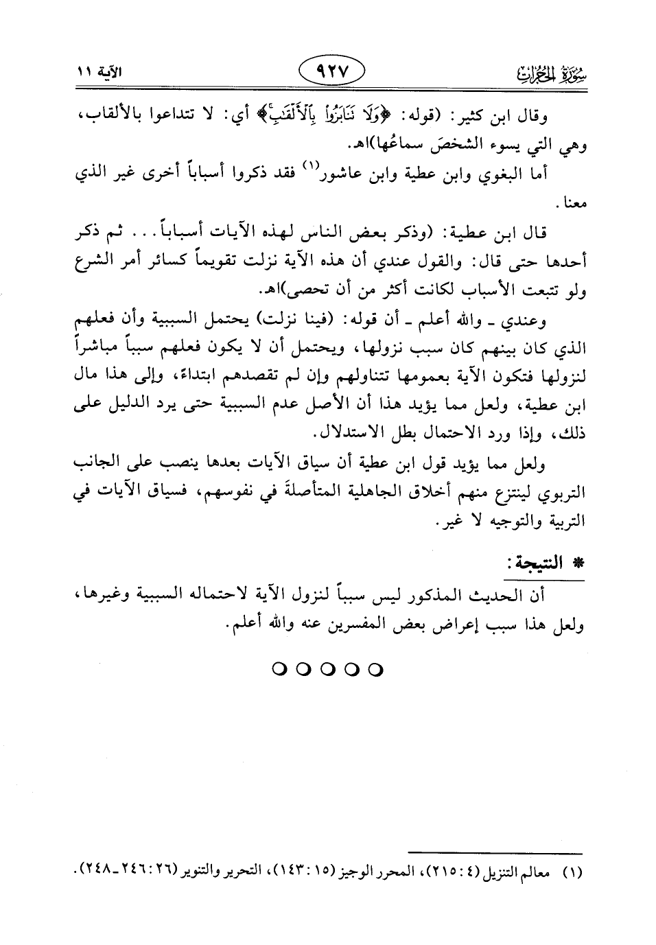 وعندي - واللَّه أعلم - أن قوله: (فينا نزلت) يحتمل السببية وأن فعلهم الذي كان بينهم كان سبب نزولها، ويحتمل أن لا يكون فعلهم سببًا مباشرًا لنزولها فتكون الآية بعمومها تتناولهم وإن لم تقصدهم ابتداءً، وإلى هذا مال ابن عطية، ولعل مما يؤيد هذا أن الأصل عدم السببية حتى يرد الدليل على ذلك، وإذا ورد الاحتمال بطل الاستدلال.