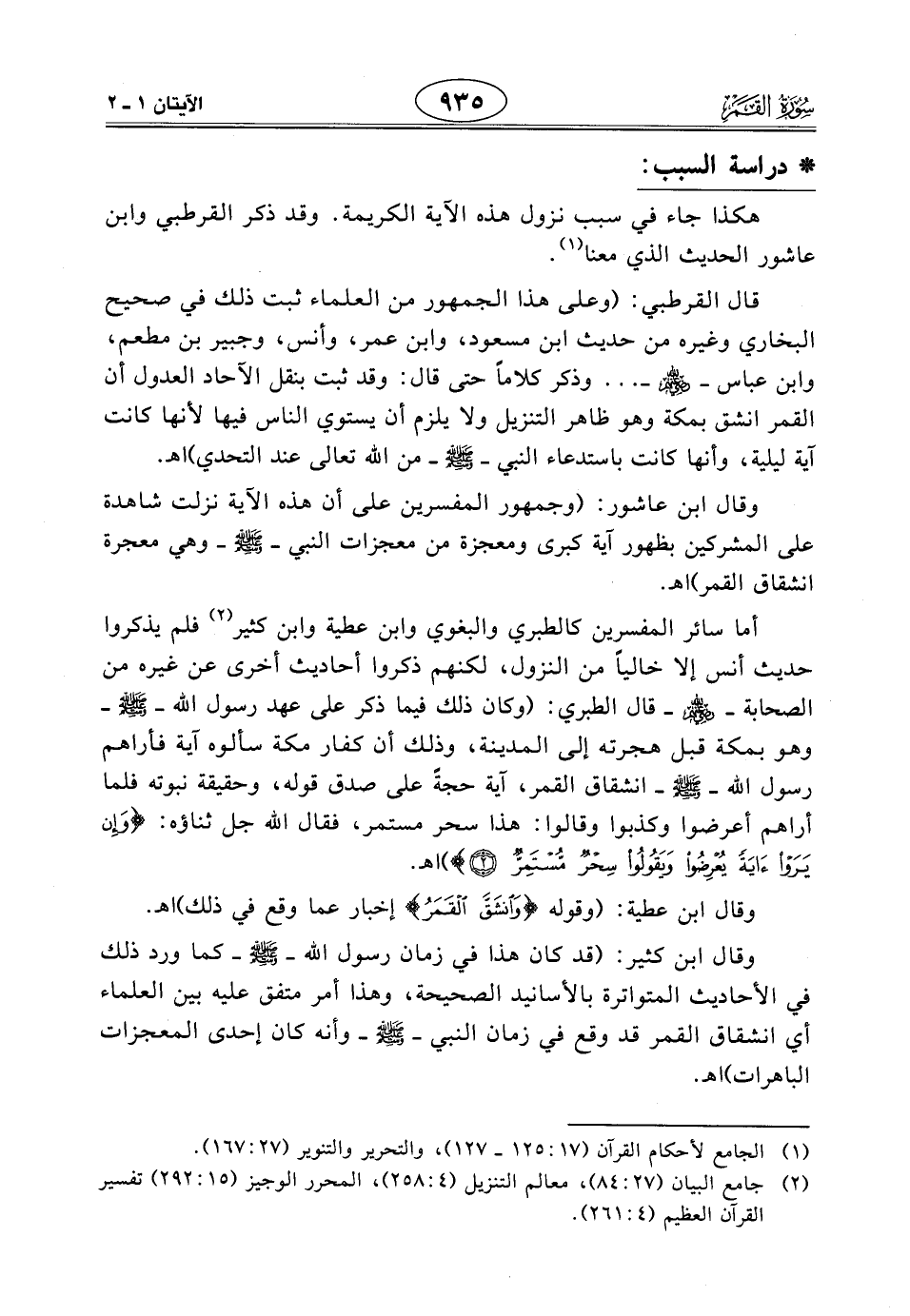 قال القرطبي: (وعلى هذا الجمهور من العلماء ثبت ذلك في صحيح البخاري وغيره من حديث ابن مسعود، وابن عمر، وأنس، وجبير بن مطعم، وابن عبَّاسٍ - رَضِيَ اللَّهُ عَنْهُمَا - ... وذكر كلامًا حتى قال: وقد ثبت بنقل الآحاد العدول أن القمر انشق بمكة وهو ظاهر التنزيل ولا يلزم أن يستوي الناس فيها لأنها كانت آية ليلية، وأنها كانت باستدعاء النبي - صَلَّى اللَّهُ عَلَيْهِ وَسَلَّمَ - من اللَّه تعالى عند التحدي). اهـ.