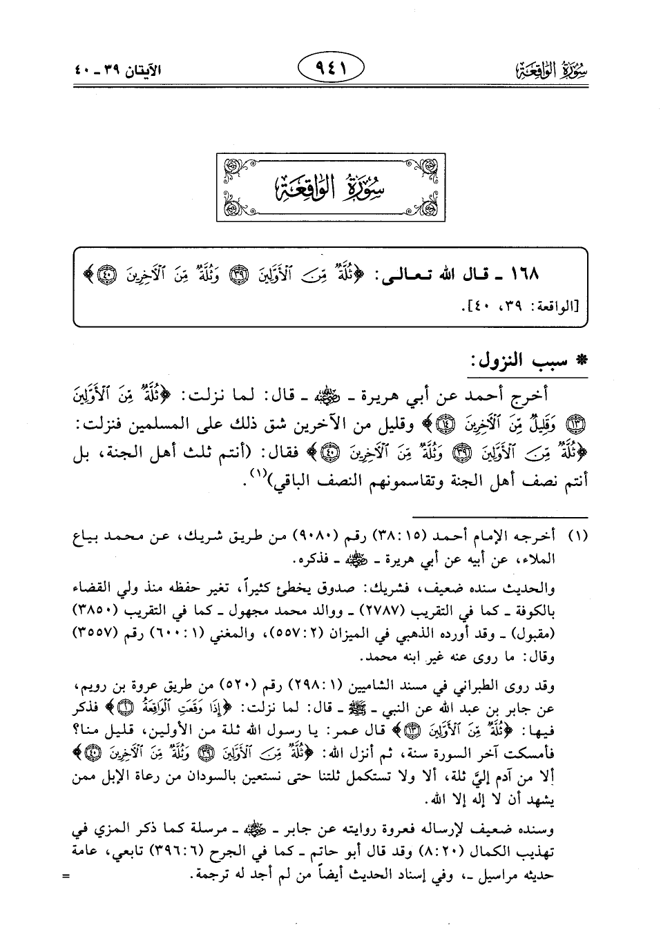 أخرج أحمد عن أبي هريرة - رَضِيَ اللَّهُ عَنْهُ - قال: لما نزلت: (ثُلَّةٌ مِنَ الْأَوَّلِينَ (13) وَقَلِيلٌ مِنَ الْآخِرِينَ) وقليل من الآخرين شق ذلك على المسلمين فنزلت: (ثُلَّةٌ مِنَ الْأَوَّلِينَ (39) وَثُلَّةٌ مِنَ الْآخِرِينَ)، فقال: (أنتم ثلث أهل الجنة، بل أنتم نصف أهل الجنة وتقاسمونهم النصف الباقي).