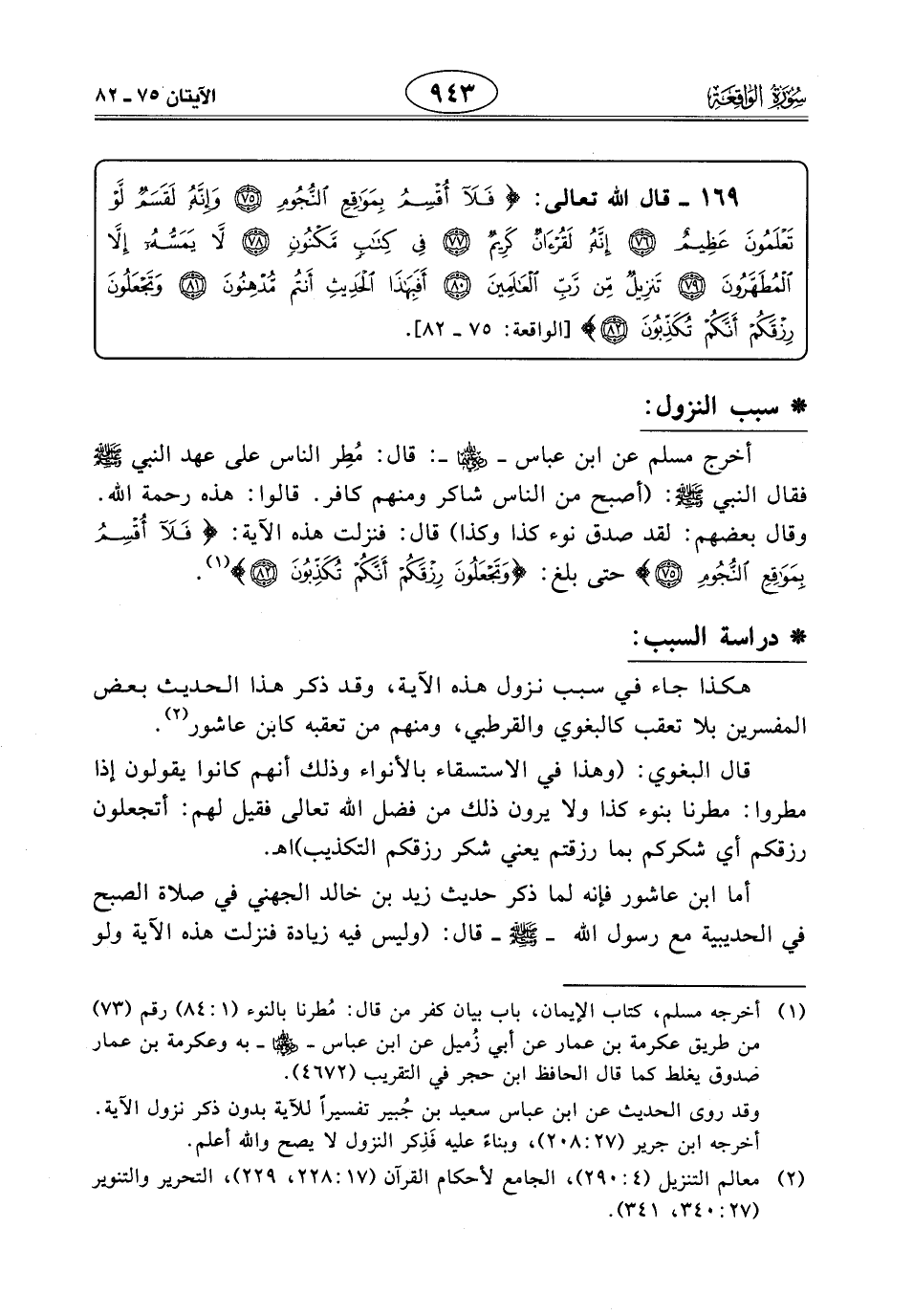 169 - قال الله تعالى: (فَلَا أُقْسِمُ بِمَوَاقِعِ النُّجُومِ (75) وَإِنَّهُ لَقَسَمٌ لَوْ تَعْلَمُونَ عَظِيمٌ (76) إِنَّهُ لَقُرْآنٌ كَرِيمٌ (77) فِي كِتَابٍ مَكْنُونٍ (78) لَا يَمَسُّهُ إِلَّا الْمُطَهَّرُونَ (79) تَنْزِيلٌ مِنْ رَبِّ الْعَالَمِينَ (80) أَفَبِهَذَا الْحَدِيثِ أَنْتُمْ مُدْهِنُونَ (81) وَتَجْعَلُونَ رِزْقَكُمْ أَنَّكُمْ تُكَذِّبُونَ (82)