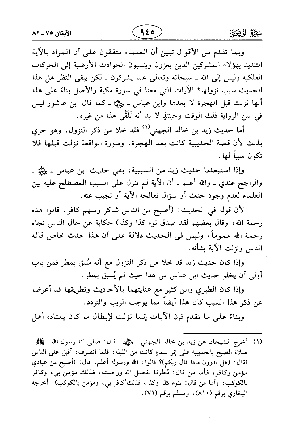 وبما تقدم من الأقوال تبين أن العلماء متفقون على أن المراد بالآية التنديد بهؤلاء المشركين الذين يعزون وينسبون الحوادث الأرضية إلى الحركات الفلكية وليس إلى الله - سبحانه وتعالى عما يشركون - لكن يبقى النظر هل هذا الحديث سبب نزولها؟ الآيات التي معنا في سورة مكية والأصل بناءً على هذا أنها نزلت قبل الهجرة لا بعدها وابن عبَّاسٍ - رَضِيَ اللَّهُ عَنْهُمَا - كما قال ابن عاشور ليس فى سن الرواية ذلك الوقت وحينئذٍ لا بد أنه تَلَقَّى هذا من غيره.