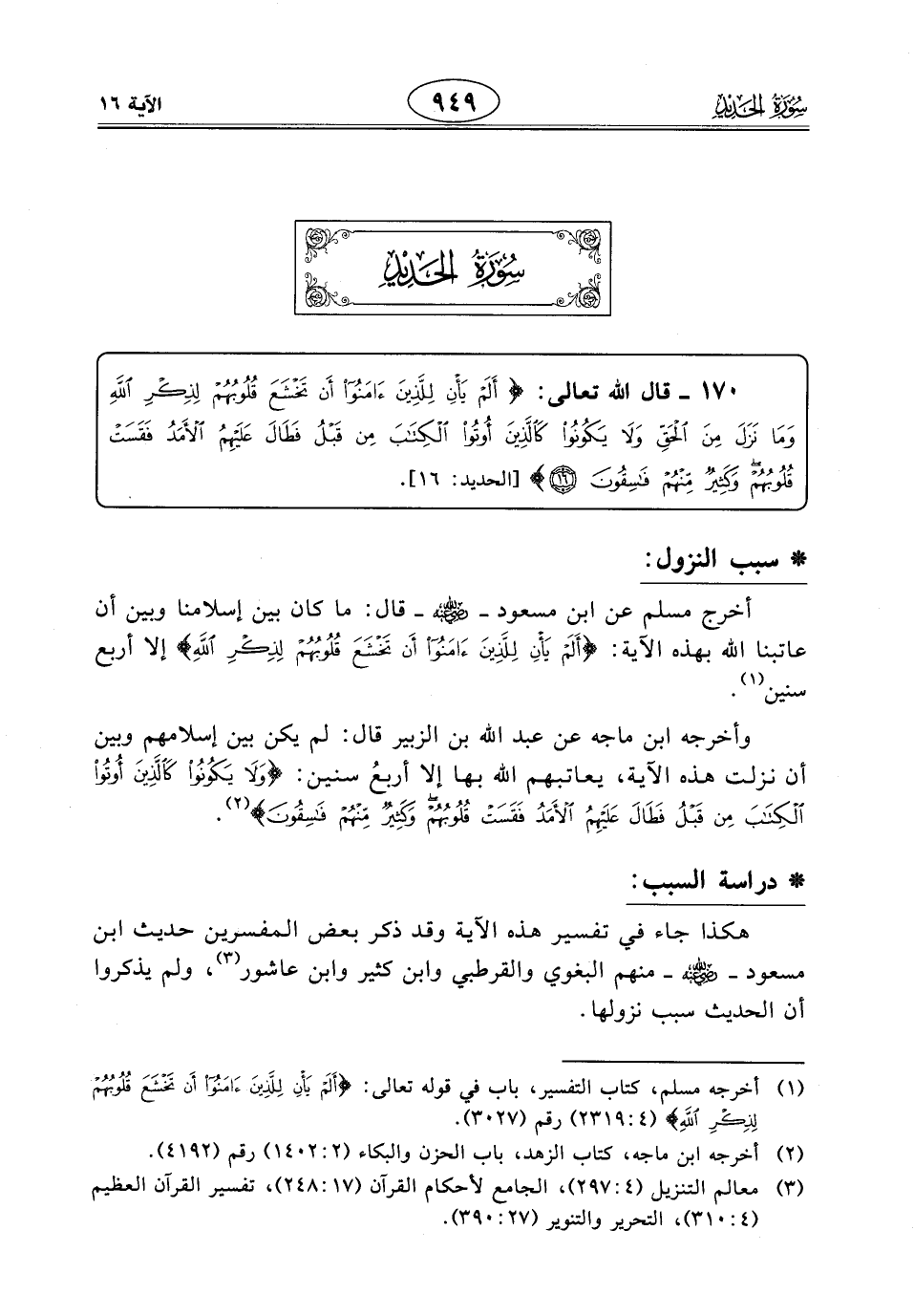 170 - قال الله تعالى: (أَلَمْ يَأْنِ لِلَّذِينَ آمَنُوا أَنْ تَخْشَعَ قُلُوبُهُمْ لِذِكْرِ اللَّهِ وَمَا نَزَلَ مِنَ الْحَقِّ وَلَا يَكُونُوا كَالَّذِينَ أُوتُوا الْكِتَابَ مِنْ قَبْلُ فَطَالَ عَلَيْهِمُ الْأَمَدُ فَقَسَتْ قُلُوبُهُمْ وَكَثِيرٌ مِنْهُمْ فَاسِقُونَ (16)