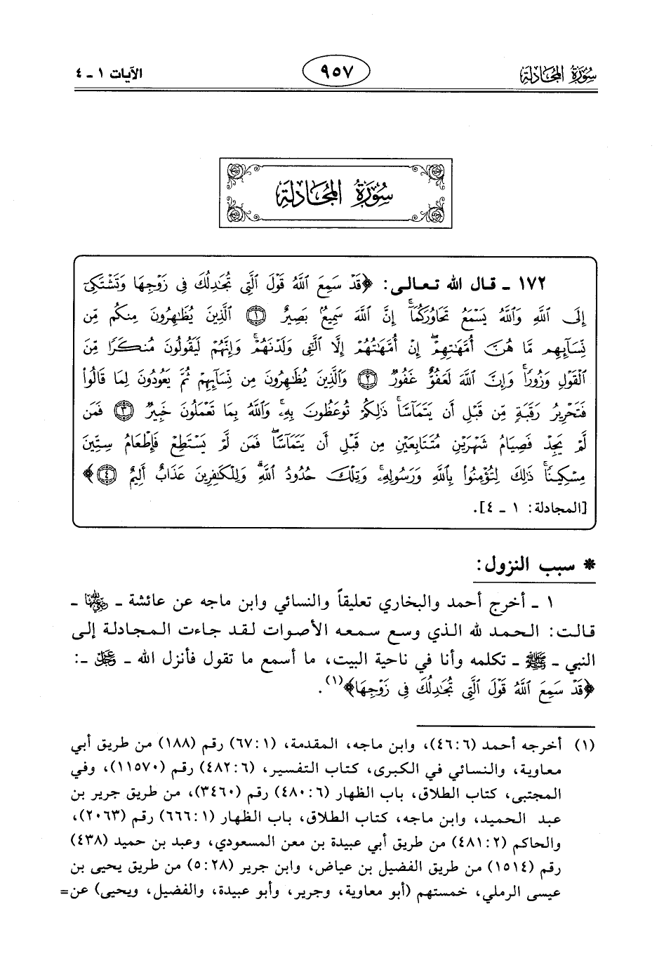 172 - قال اللَّه تعالى: (قَدْ سَمِعَ اللَّهُ قَوْلَ الَّتِي تُجَادِلُكَ فِي زَوْجِهَا وَتَشْتَكِي إِلَى اللَّهِ وَاللَّهُ يَسْمَعُ تَحَاوُرَكُمَا إِنَّ اللَّهَ سَمِيعٌ بَصِيرٌ (1) الَّذِينَ يُظَاهِرُونَ مِنْكُمْ مِنْ نِسَائِهِمْ مَا هُنَّ أُمَّهَاتِهِمْ إِنْ أُمَّهَاتُهُمْ إِلَّا اللَّائِي وَلَدْنَهُمْ وَإِنَّهُمْ لَيَقُولُونَ مُنْكَرًا مِنَ الْقَوْلِ وَزُورًا وَإِنَّ اللَّهَ لَعَفُوٌّ غَفُورٌ (2) وَالَّذِينَ يُظَاهِرُونَ مِنْ نِسَائِهِمْ ثُمَّ يَعُودُونَ لِمَا قَالُوا فَتَحْرِيرُ رَقَبَةٍ مِنْ قَبْلِ أَنْ يَتَمَاسَّا ذَلِكُمْ تُوعَظُونَ بِهِ وَاللَّهُ بِمَا تَعْمَلُونَ خَبِيرٌ (3) فَمَنْ لَمْ يَجِدْ فَصِيَامُ شَهْرَيْنِ مُتَتَابِعَيْنِ مِنْ قَبْلِ أَنْ يَتَمَاسَّا فَمَنْ لَمْ يَسْتَطِعْ فَإِطْعَامُ سِتِّينَ مِسْكِينًا ذَلِكَ لِتُؤْمِنُوا بِاللَّهِ وَرَسُولِهِ وَتِلْكَ حُدُودُ اللَّهِ وَلِلْكَافِرِينَ عَذَابٌ أَلِيمٌ (4)