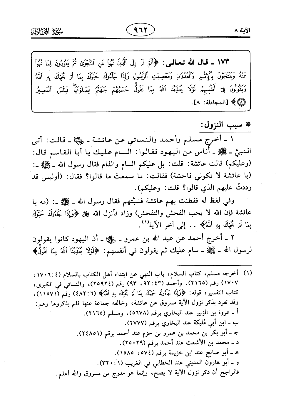 وفي لفظ له ففطنت بهم عاثشة فسبَّتهم فقال رسول اللَّه - صَلَّى اللَّهُ عَلَيْهِ وَسَلَّمَ -: (مه يا عائشة فإن اللَّه لا يحب الفحش والتفحش) وزاد فأنزل الله - عَزَّ وَجَلَّ - (وَإِذَا جَاءُوكَ حَيَّوْكَ بِمَا لَمْ يُحَيِّكَ بِهِ اللَّهُ) .. إلى آخر الآية.