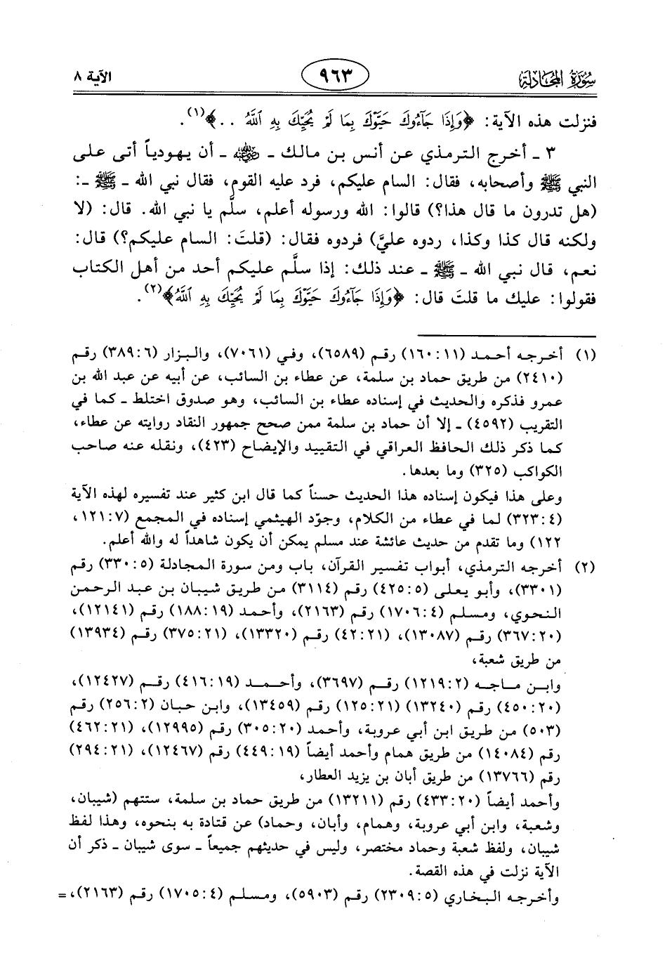 3 - أخرج الترمذي عن أنس بن مالك - رَضِيَ اللَّهُ عَنْهُ - أن يهودياً أتى على النبي - صَلَّى اللَّهُ عَلَيْهِ وَسَلَّمَ - وأصحابه، فقال: السام عليكم، فرد عليه القوا، فقال نبي اللَّه - صَلَّى اللَّهُ عَلَيْهِ وَسَلَّمَ -: (هل تدرون ما قال هذا؟) قالوا: الله ورسوله أعلم، سلَّم يا نبي الله. قال: (لا ولكنه قال كذا وكذا، ردوه عليَّ) فردوه فقال: (قلتَ: السام عليكم؟) قال: نعم، قال نبي الله - صَلَّى اللَّهُ عَلَيْهِ وَسَلَّمَ - عند ذلك: إذا سلَّم عليكم أحد من أهل الكتاب فقولوا: عليك ما قلتَ قال: (وَإِذَا جَاءُوكَ حَيَّوْكَ بِمَا لَمْ يُحَيِّكَ بِهِ اللَّهُ).