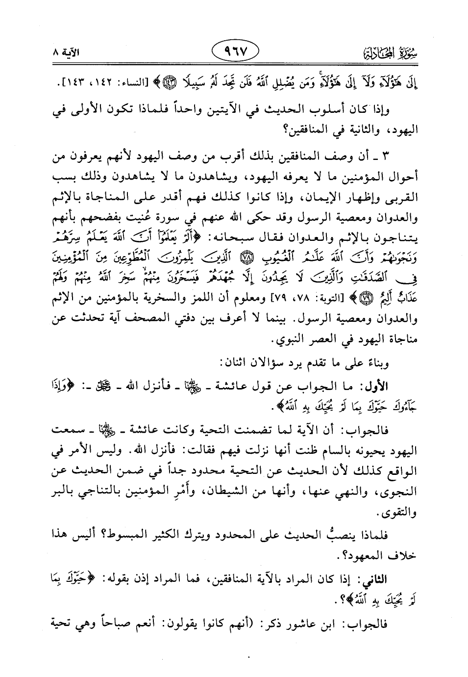 فالجواب: أن الآية لما تضمنت التحية وكانت عائشة - رضي الله عنها - سمعت اليهود يحيونه بالسام ظنت أنها نزلت فيهم فقالت: فأنزل الله. وليس الأمر في الواقع كذلك لأن الحديث عن التحية محدود جدًا في ضمن الحديث عن النجوى، والنهي عنها، وأنها من الشيطان، وأَمْرِ المؤمنين بالتناجي بالبر والتقوى.