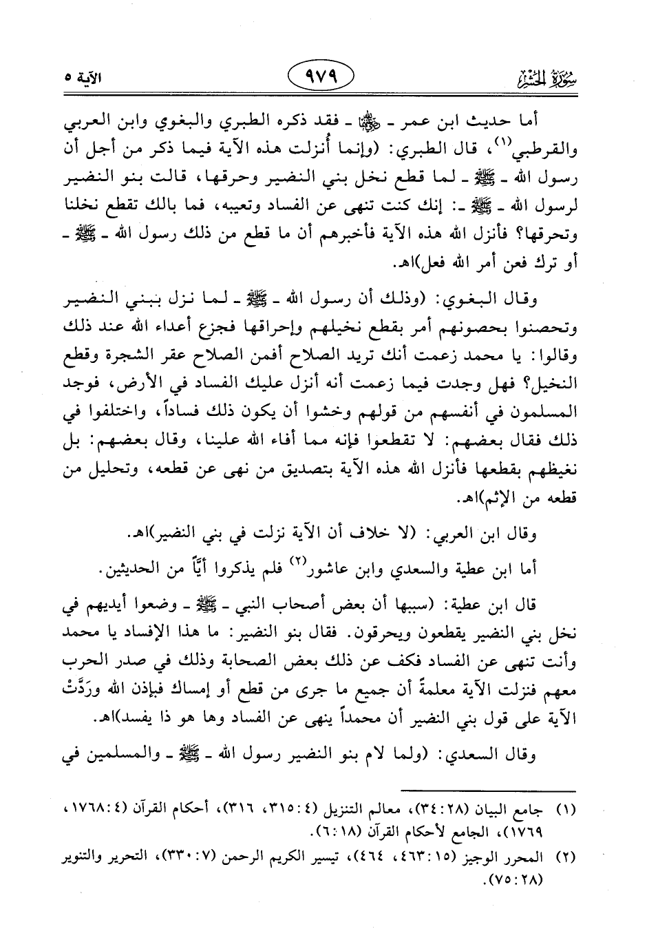أما حديث ابن عمر - رَضِيَ اللَّهُ عَنْهُمَا - فقد ذكره الطبري والبغوي وابن العربي والقرطبي، قال الطبري: (وإنما أُنزلت هذه الآية فيما ذكر من أجل أن رسول الله - صَلَّى اللَّهُ عَلَيْهِ وَسَلَّمَ - لما قطع نخل بني النضير وحرقها، قالت بنو النضير لرسول اللَّه - صَلَّى اللَّهُ عَلَيْهِ وَسَلَّمَ -: إنك كنت تنهى عن الفساد وتعيبه، فما بالك تقطع نخلنا وتحرقها؟ فأنزل الله هذه الآية فأخبرهم أن ما قطع من ذلك رسول اللَّه - صَلَّى اللَّهُ عَلَيْهِ وَسَلَّمَ - أو ترك فعن أمر الله فعل) اهـ.
