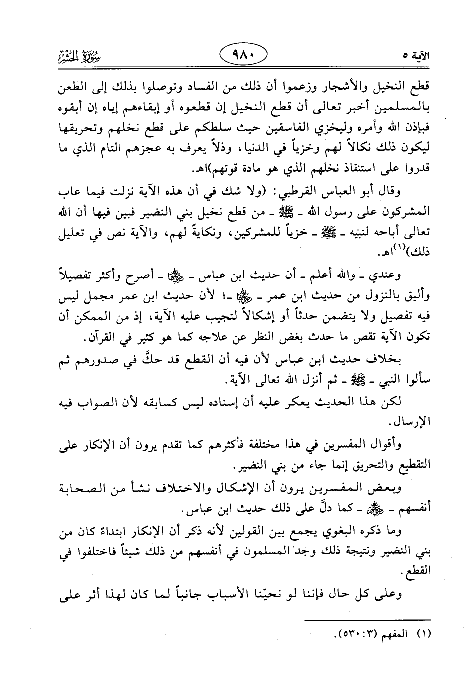 وقال أبو العباس القرطبي: (ولا شك في أن هذه الآية نزلت فيما عاب المشركون على رسول اللَّه - صَلَّى اللَّهُ عَلَيْهِ وَسَلَّمَ - من قطع نخيل بني النضير فبين فيها أن الله تعالى أباحه لنبيه - صَلَّى اللَّهُ عَلَيْهِ وَسَلَّمَ - خزيًا للمشركين، ونكايةً لهم، والآية نص في تعليل ذلك) اهـ.