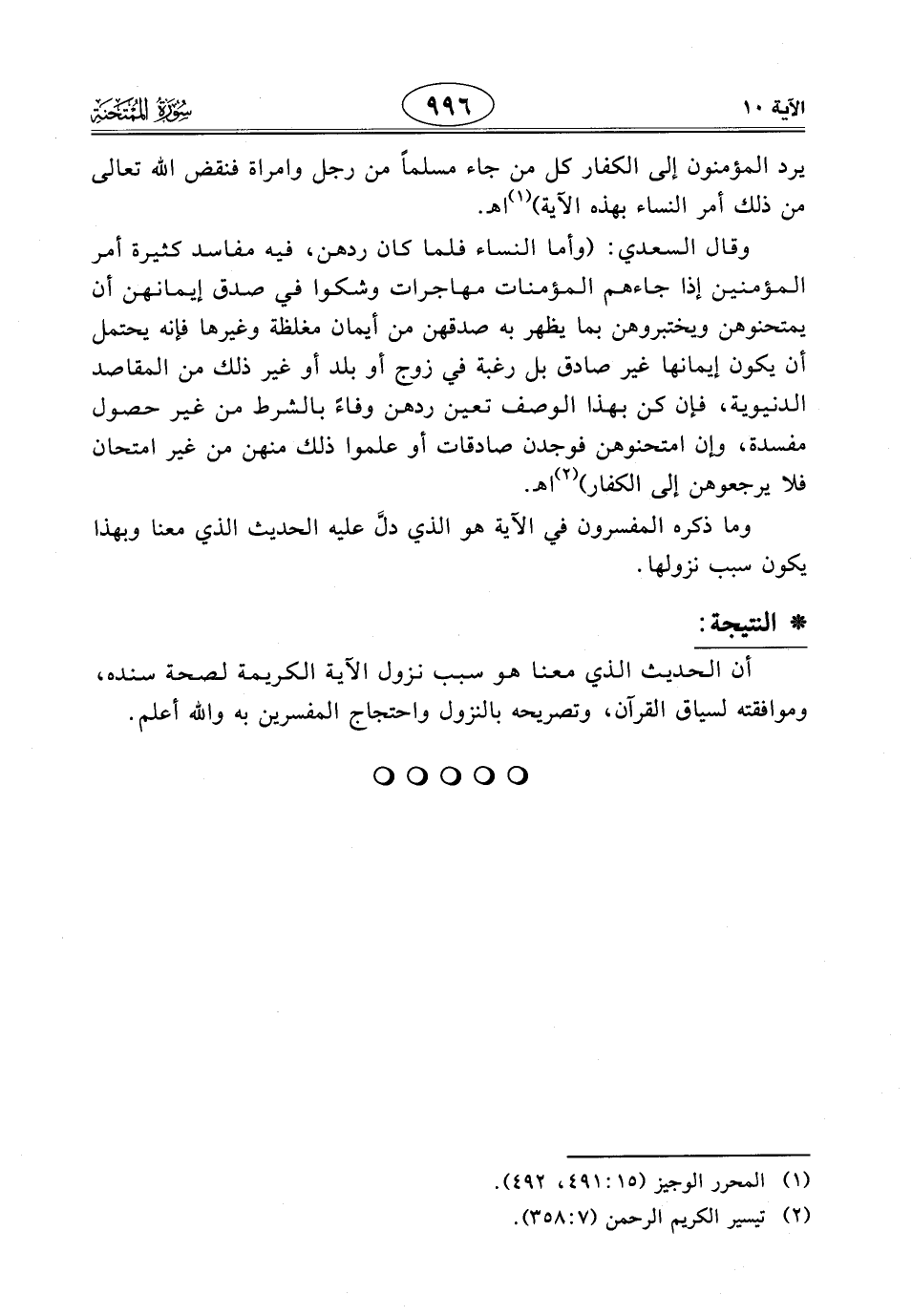 وقال السعدي: (وأما النساء فلما كان ردهن، فيه مفاسد كثيرة أمر المؤمنين إذا جاءهم المؤمنات مهاجرات وشكوا في صدق إيمانهن أن يمتحنوهن ويختبروهن بما يظهر به صدقهن من أيمان مغلظة وغيرها فإنه يحتمل أن يكون إيمانها غير صادق بل رغبة في زوج أو بلد أو غير ذلك من المقاصد الدنيوية، فإن كن بهذا الوصف تعين ردهن وفاءً بالشرط من غير حصول مفسدة، وإن امتحنوهن فوجدن صادقات أو علموا ذلك منهن من غير امتحان فلا يرجعوهن إلى الكفار) اهـ.