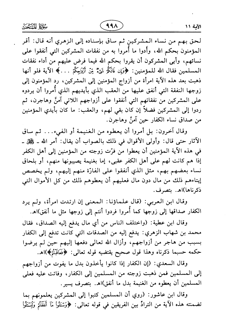 وقال ابن عطية: (واختلف الناس من أي مال يدفع إليه الصداق، فقال محمد بن شهاب الزهري: يدفع إليه من الصدقات التي كانت تدفع إلى الكفار بسبب من هاجر من أزواجهم، وأزال الله تعالى دفعها إليهم حين لم يرضوا حكمه حسبما ذكرناه وهذا قول صحيح يقتضيه قوله تعالى: (فَعَاقَبْتُمْ) اهـ.