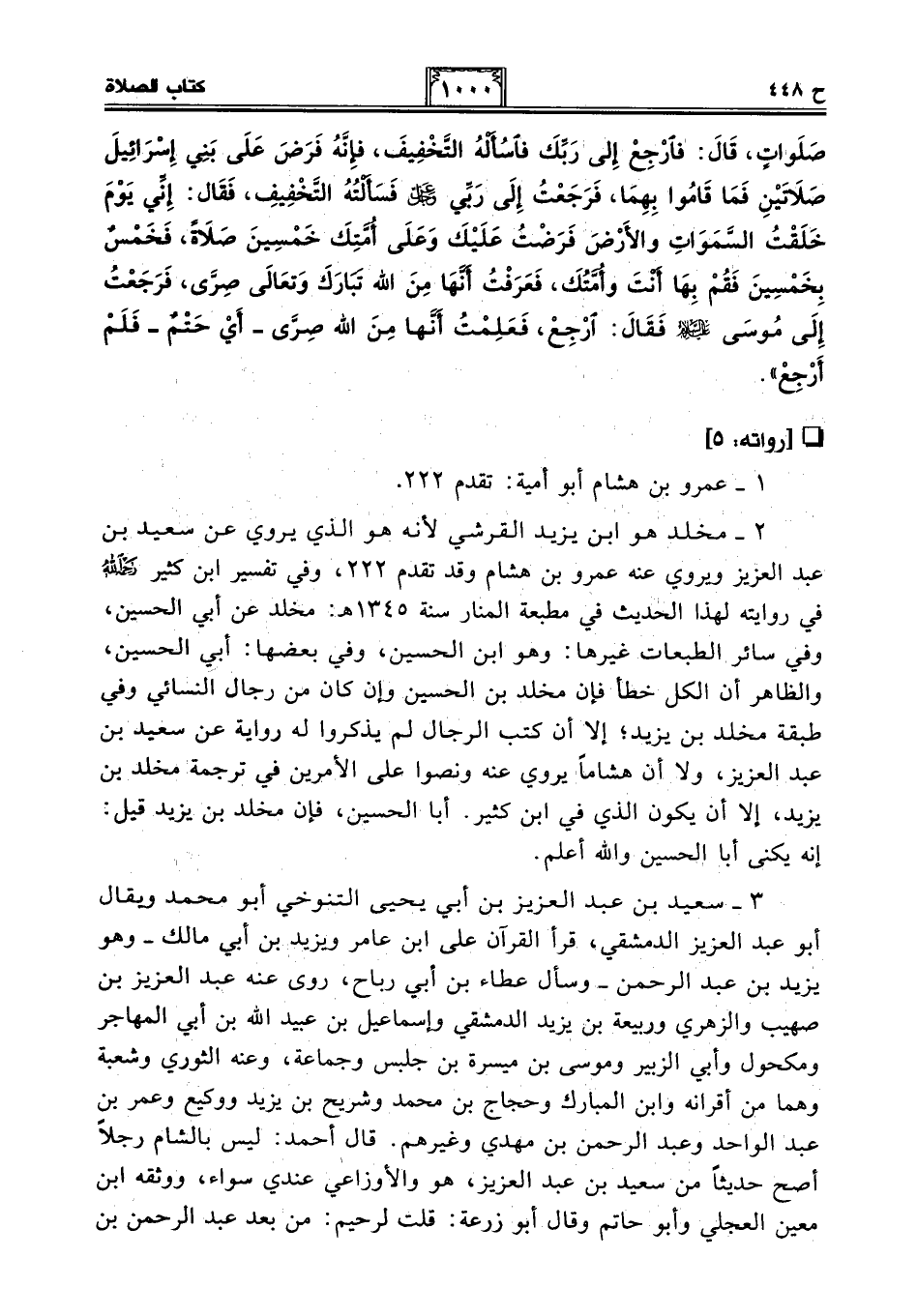 2 - مخلد هو ابن يزيد القرشي لأنه هو الذي يروي عن سعيد بن عبد العزيز ويروي عنه عمرو بن هشام وقد تقدم 222، وفي تفسير ابن كثير -رحمه الله- في روايته لهذا الحديث في مطبعة المنار سنة 1345 هـ: مخلد عن أبي الحسين، وفي سائر الطبعات غيرها: وهو ابن الحسين، وفي بعضها: أبي الحسين، والظاهر أن الكل خطأ فإن مخلد بن الحسين وإن كان من رجال النسائي وفي طبقة مخلد بن يزيد؛ إلا أن كتب الرجال لم يذكروا له رواية عن سعيد بن عبد العزيز، ولا أن هشامًا يروي عنه ونصوا على الأمرين في ترجمة مخلد بن يزيد، إلا أن يكون الذي في ابن كثير. أبا الحسين، فإن مخلد بن يزيد قيل: إنه يكنى أبا الحسين والله أعلم.
