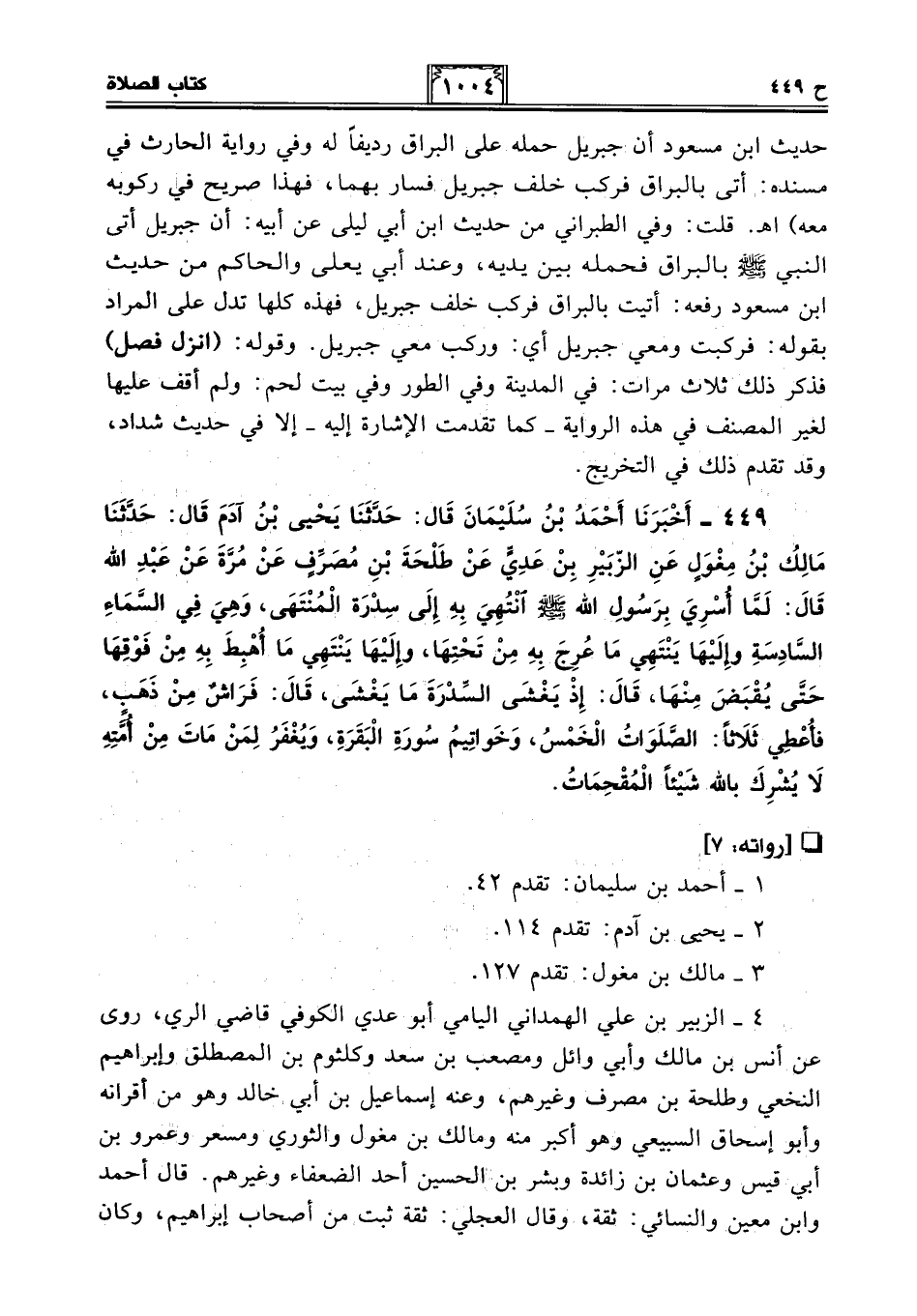 449 - أَخْبَرَنَا أَحْمَدُ بْنُ سُلَيْمَانَ قَالَ: حَدَّثَنَا يَحْيَى بْنُ آدَمَ قَالَ: حَدَّثَنَا مَالِكُ بْنُ مِغْوَلٍ عَنِ الزُّبَيْرِ بْنِ عَدِيٍّ عَنْ طَلْحَةَ بْنِ مُصَرِّفٍ عَنْ مُرَّةَ عَنْ عَبْدِ اللَّهِ قَالَ: لَمَّا أُسْرِيَ بِرَسُولِ اللَّهِ - صلى الله عليه وسلم - انْتُهِيَ بِهِ إِلَى سِدْرَةِ الْمُنْتَهَى، وَهِيَ فِي السَّمَاءِ السَّادِسَةِ وَإِلَيْهَا يَنْتَهِي مَا عُرِجَ بِهِ مِنْ تَحْتِهَا، وَإِلَيْهَا يَنْتَهِي مَا أُهْبِطَ بِهِ مِنْ فَوْقِهَا حَتَّى يُقْبَضَ مِنْهَا، قَالَ: إِذْ يَغْشَى السِّدْرَةَ مَا يَغْشَى، قَالَ: فَرَاشٌ مِنْ ذَهَبٍ، فَأُعْطِيَ ثَلَاثًا: الصَّلَوَاتُ الْخَمْسُ، وَخَوَاتِيمُ سُورَةِ الْبَقَرَةِ، وَيُغْفَرُ لِمَنْ مَاتَ مِنْ أُمَّتِهِ لَا يُشْرِكَ بِاللَّهِ شَيْئًا الْمُقْحِمَاتُ.