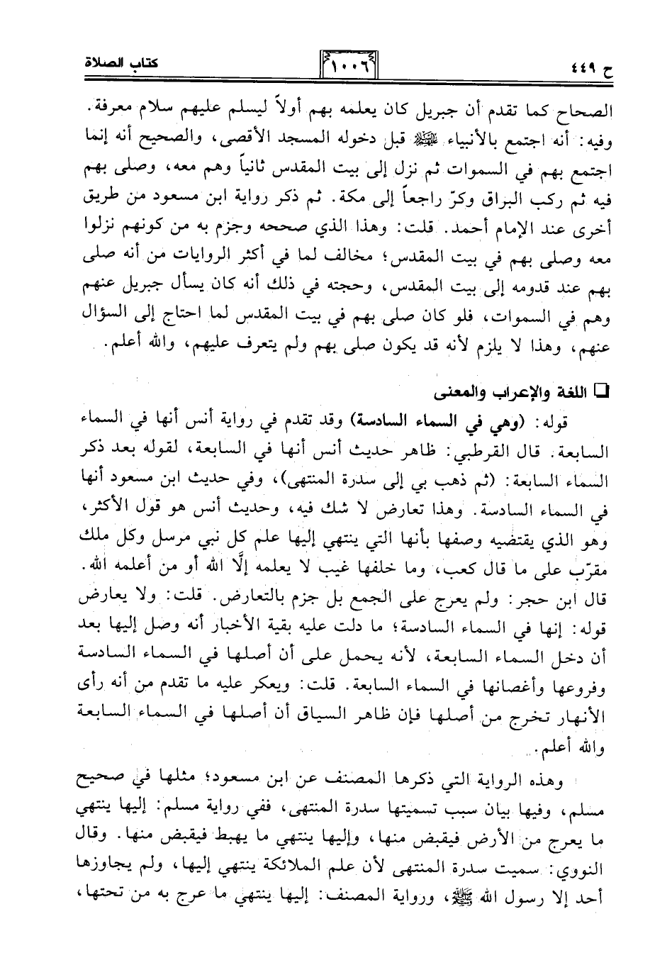 قوله: (وهي في السماء السادسة) وقد تقدم في رواية أنس أنها في السماء السابعة. قال القرطبي: ظاهر حديث أنس أنها في السابعة، لقوله بعد ذكر السماء السابعة: (ثم ذهب بي إلى سدرة المنتهى)، وفي حديث ابن مسعود أنها في السماء السادسة. وهذا تعارض لا شك فيه، وحديث أنس هو قول الأكثر، وهو الذي يقتضيه وصفها بأنها التي ينتهي إليها علم كل نبي مرسل وكل ملك مقرّب على ما قال كعب، وما خلفها غيب لا يعلمه إلَّا الله أو من أعلمه الله. قال ابن حجر: ولم يعرج على الجمع بل جزم بالتعارض. قلت: ولا يعارض قوله: إنها في السماء السادسة؛ ما دلت عليه بقية الأخبار أنه وصل إليها بعد أن دخل السماء السابعة، لأنه يحمل على أن أصلها في السماء السادسة وفروعها وأغصانها في السماء السابعة. قلت: ويعكر عليه ما تقدم من أنه رأى الأنهار تخرج من أصلها فإن ظاهر السياق أن أصلها في السماء السابعة والله أعلم.