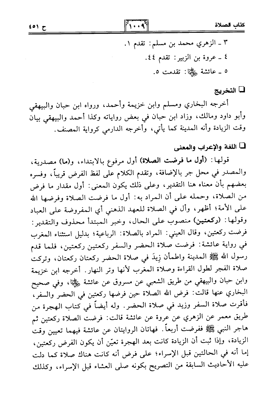 قولها: (أول ما فرضت الصلاة) أول مرفوع بالإبتداء، و (ما) مصدرية، والمصدر في محل جر بالإضافة، وتقدم الكلام على لفظ الفرض قريبًا، وفسره بعضهم بأن معناه هنا التقدير، وعلى ذلك يكون المعنى: أول مقدار ما فرض من الصلاة، وحمله على أن المراد به: أول ما فرضت الصلاة وفرضها الله على الأمة؛ أظهر، وأل في الصلاة للعهد الذهني أي المفروضة على العباد وقولها: (ركعتين) منصوب على الحال، وخبر المبتدأ محذوف والتقدير: فرضت ركعتين، وقال العيني: المراد بالصلاة: الرباعية؛ بدليل استثناء المغرب في رواية عائشة: فرضت صلاة الحضر والسفر ركعتين ركعتين، فلما قدم رسول الله - صلى الله عليه وسلم - المدينة واطمأن زِيدَ في صلاة الحضر ركعتان ركعتان، وتركت صلاة الفجر لطول القراءة وصلاة المغرب لأنها وتر النهار. أخرجه ابن خزيمة وابن حبان والبيهقي من طريق الشعبي عن مسروق عن عائشة -رضي الله عنها-، وفي صحيح البخاري عنها قالت: فرض الله الصلاة حين فرضها ركعتين في الحضر والسفر، فأقرت صلاة السفر وزيد في صلاة الحضر. وله أيضًا في كتاب الهجرة من طريق معمر عن الزهري عن عروة عن عائشة قالت: فرضت الصلاة ركعتين ثم هاجر النبي - صلى الله عليه وسلم - ففرضت أربعًا. فهاتان الروايتان عن عائشة فيهما تعيين وقت الزيادة، وإذا ثبت أن الزيادة كانت بعد الهجرة تعين أن يكون الفرض ركعتين، إما أنه في الحالتين قبل الإسراء؛ على فرض أنه كانت هناك صلاة كما دلت عليه الأحاديث السابقة من التصريح بكونه صلى العشاء قبل الإسراء، وكذلك