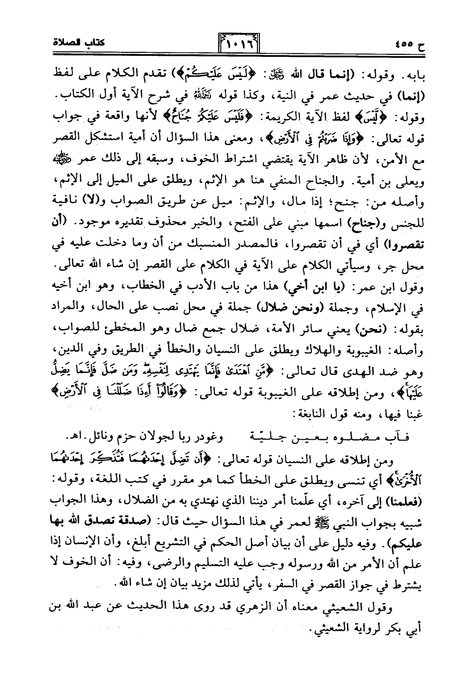 بابه. وقوله: (إنما قال الله -عز وجل-: {لَيْسَ عَلَيْكُمْ} تقدم الكلام على لفظ (إنما) في حديث عمر في النية، وكذا قوله -رحمه الله- في شرح الآية أول الكتاب. وقوله: {لَيْسَ} لفظ الآية الكريمة: {فَلَيْسَ عَلَيْكُمْ جُنَاحٌ} لأنها واقعة في جواب قوله تعالى: {وَإِذَا ضَرَبْتُمْ فِي الْأَرْضِ}، ومعنى هذا السؤال أن أمية استشكل القصر مع الأمن، لأن ظاهر الآية يقتضي اشتراط الخوف، وسبقه إلى ذلك عمر - رضي الله عنه - ويعلى بن أمية. والجناح المنفي هنا هو الإثم، ويطلق على الميل إلى الإثم، وأصله من: جنح؛ إذا مال، والإثم: ميل عن طريق الصواب و (لا) نافية للجنس و (جناح) اسمها مبني على الفتح، والخبر محذوف تقديره موجود. (أن تقصروا) أي في أن تقصروا، فالمصدر المنسبك من أن وما دخلت عليه في محل جر، وسيأتي الكلام على الآية في الكلام على القصر إن شاء الله تعالى. وقول ابن عمر: (يا ابن أخي) هذا من باب الأدب في الخطاب، وهو ابن أخيه في الإِسلام، وجملة (ونحن ضلال) جملة في محل نصب على الحال، والمراد بقوله: (نحن) يعني سائر الأمة، ضلال جمع ضال وهو المخطئ للصواب، وأصله: الغيبوبة والهلاك ويطلق على النسيان والخطأ في الطريق وفي الدين، وهو ضد الهدى قال تعالى: {مَنِ اهْتَدَى فَإِنَّمَا يَهْتَدِي لِنَفْسِهِ وَمَنْ ضَلَّ فَإِنَّمَا يَضِلُّ عَلَيْهَا}، ومن إطلاقه على الغيبوبة قوله تعالى: {وَقَالُوا أَإِذَا ضَلَلْنَا فِي الْأَرْضِ} غبنا فيها، ومنه قول النابغة: