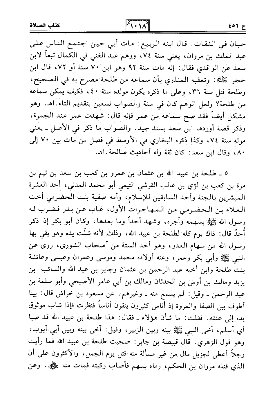 حبان في الثقات. قال ابنه الربيع: مات أبي حين اجتمع الناس على عبد الملك بن مروان، يعني سنة 74، ووهم عبد الغني في الكمال تبعًا لابن سعد عن الواقدي فقال: إنه مات سنة 92 وهو ابن 70 سنة أو 72، قال ابن حجر -رحمه الله-: وتعقبه المنذري بأن سماعه من طلحة مصرح به في الصحيح، وطلحة قتل سنة 36، وعلى ما ذكره يكون مولده سنة 40، فكيف يمكن سماعه من طلحة؟ ولعل الوهم كان في سنة والصواب تسعين بتقديم التاء. اهـ. وهو مشكل أيضًا فقد صح سماعه من عمر فإنه قال: شهدت عمر عند الجمرة، وذكر قصة أوردها ابن سعد بسند جيد. والصواب ما ذكر في الأصل -يعني موته سنة 74، وكذا ذكره البخاري في الأوسط في فصل من مات بين 70 إلى 80، وقال ابن سعد: كان ثقة وله أحاديث صالحة. اهـ.