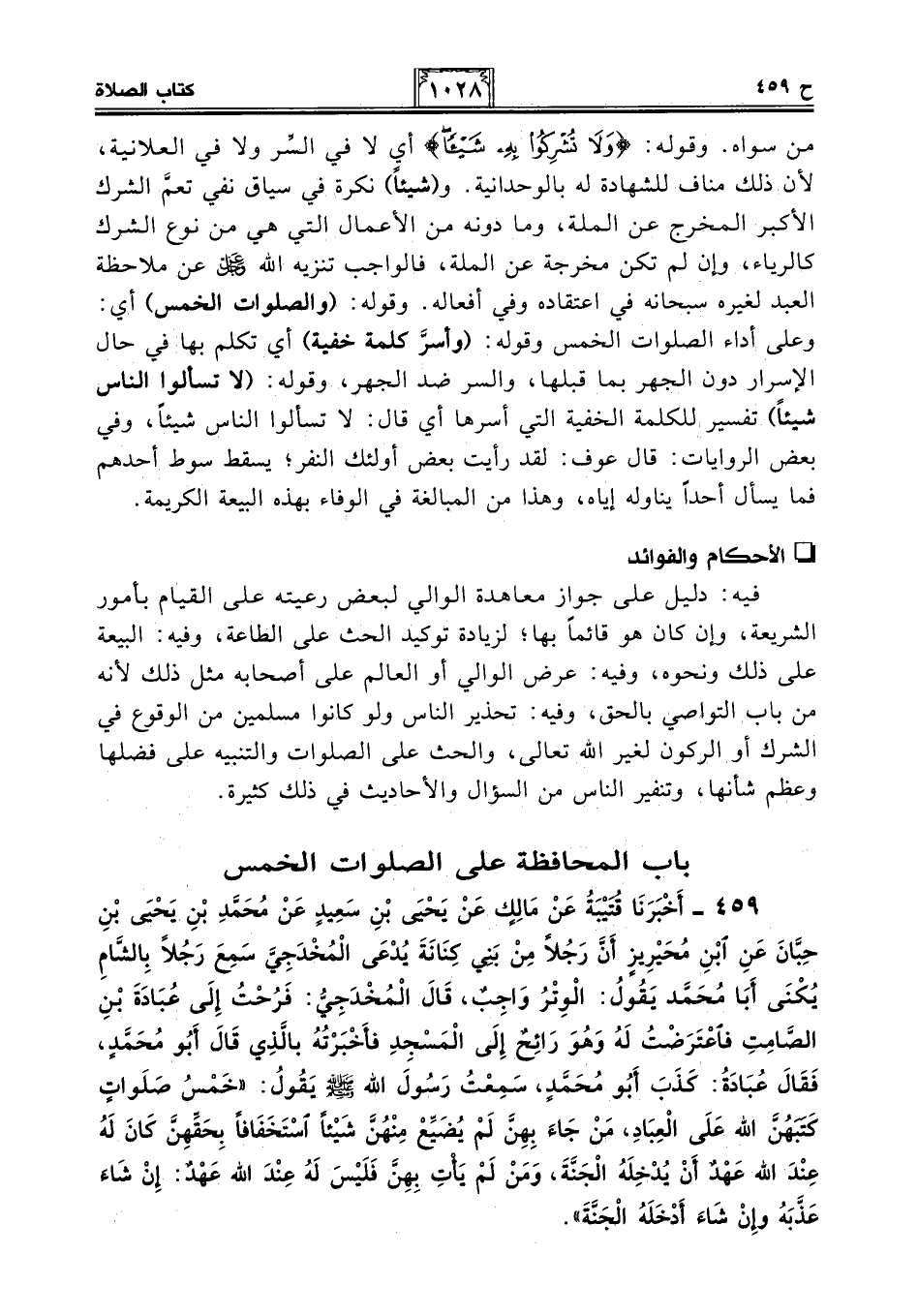 من سواه. وقوله: {وَلَا تُشْرِكُوا بِهِ شَيْئًا} أي لا في السِّر ولا في العلانية، لأن ذلك مناف للشهادة له بالوحدانية. و (شيئًا) نكرة في سياق نفي تعمَّ الشرك الأكبر المخرج عن الملة، وما دونه من الأعمال التي هي من نوع الشرك كالرياء، وإن لم تكن مخرجة عن الملة، فالواجب تنزيه الله -عز وجل- عن ملاحظة العبد لغيره سبحانه في اعتقاده وفي أفعاله. وقوله: (والصلوات الخمس) أي: وعلى أداء الصلوات الخمس وقوله: (وأسرَّ كلمة خفية) أي تكلم بها في حال الإسرار دون الجهر بما قبلها، والسر ضد الجهر، وقوله: (لا تسألوا الناس شيئًا) تفسير للكلمة الخفية التي أسرها أي قال: لا تسألوا الناس شيئًا، وفي بعض الروايات: قال عوف: لقد رأيت بعض أولئك النفر؛ يسقط سوط أحدهم فما يسأل أحدًا يناوله إياه، وهذا من المبالغة في الوفاء بهذه البيعة الكريمة.