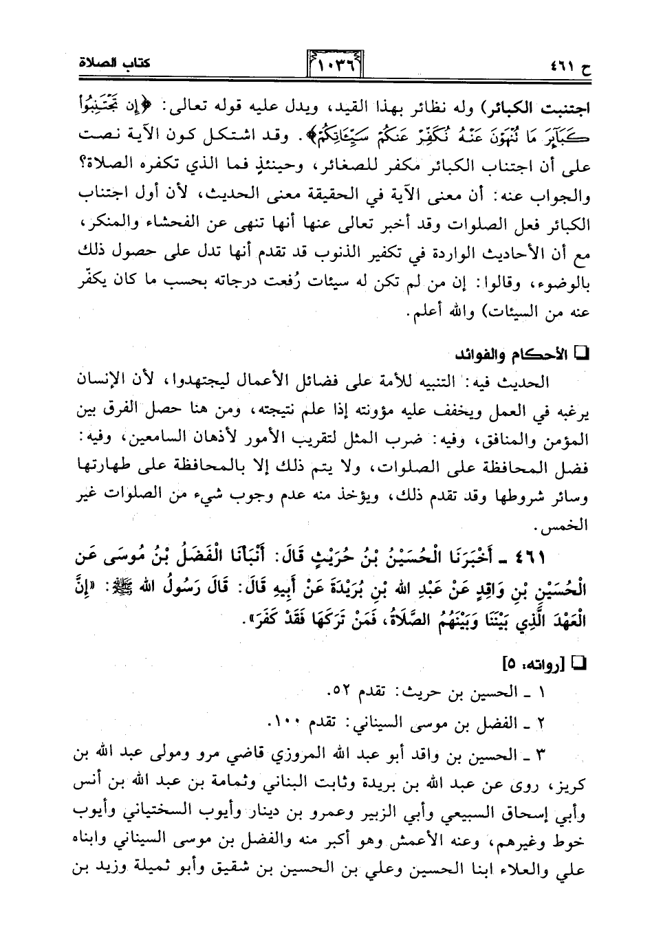 461 - أَخْبَرَنَا الْحُسَيْنُ بْنُ حُرَيْثٍ قَالَ: أَنْبَأَنَا الْفَضْلُ بْنُ مُوسَى عَنِ الْحُسَيْنِ بْنِ وَاقِدٍ عَنْ عَبْدِ اللَّهِ بْنِ بُرَيْدَةَ عَنْ أَبِيهِ قَالَ: قَالَ رَسُولُ اللَّهِ - صلى الله عليه وسلم -: "إِنَّ الْعَهْدَ الَّذِي بَيْنَنَا وَبَيْنَهُمُ الصَّلَاةُ، فَمَنْ تَرَكَهَا فَقَدْ كَفَرَ".