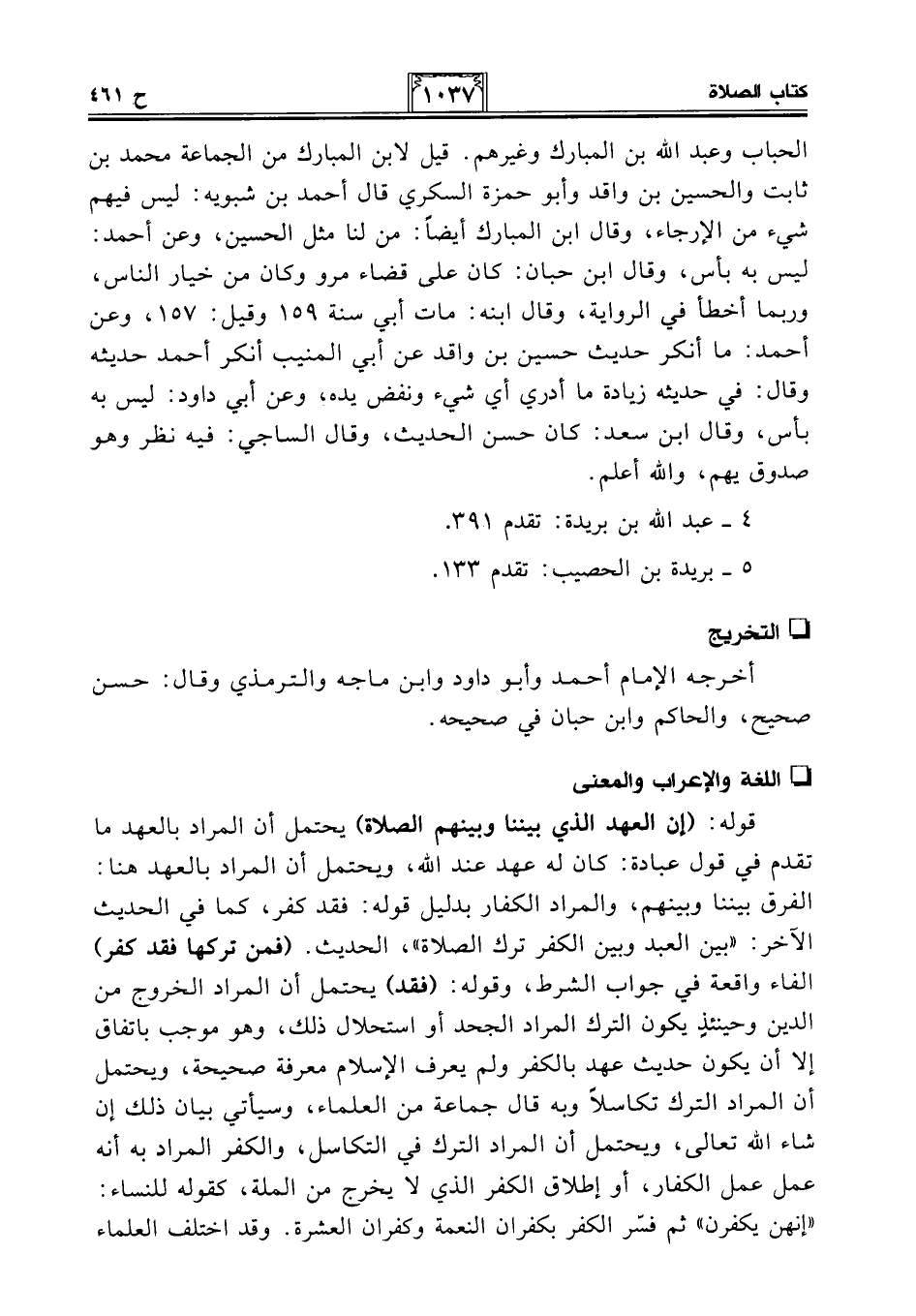قوله: (إن العهد الذي بيننا وبينهم الصلاة) يحتمل أن المراد بالعهد ما تقدم في قول عبادة: كان له عهد عند الله، ويحتمل أن المراد بالعهد هنا: الفرق بيننا وبينهم، والمراد الكفار بدليل قوله: فقد كفر، كما في الحديث الآخر: "بين العبد وبين الكفر ترك الصلاة"، الحديث. (فمن تركها فقد كفر) الفاء واقعة في جواب الشرط، وقوله: (فقد) يحتمل أن المراد الخروج من الدين وحينئذٍ يكون الترك المراد الجحد أو استحلال ذلك، وهو موجب بإتفاق إلا أن يكون حديث عهد بالكفر ولم يعرف الإِسلام معرفة صحيحة، ويحتمل أن المراد الترك تكاسلًا وبه قال جماعة من العلماء، وسيأتي بيان ذلك إن شاء الله تعالى، ويحتمل أن المراد الترك في التكاسل، والكفر المراد به أنه عمل عمل الكفار، أو إطلاق الكفر الذي لا يخرج من الملة، كقوله للنساء: "إنهن يكفرن" ثم فسّر الكفر بكفران النعمة وكفران العشرة. وقد اختلف العلماء