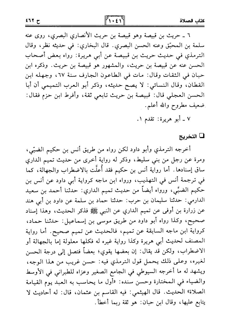 أخرجه الترمذي وأبو داود لكن رواه من طريق أنس بن حكيم الضبّي، ومرة عن رجل من بني سليط، وذكر له رواية أخرى من حديث تميم الداري ساق إسنادها. أما رواية أنس بن حكيم فقد أُعلَّت بالإضطراب والجهالة، كما في ترجمة أنس في التهذيب، ورواه ابن ماجه كرواية أبي داود عن أنس بن حكيم الضبَّي، ورواه أيضًا من حديث تميم الداري: حدثنا أحمد بن سعيد الدارمي: حدثنا سليمان بن حرب: حدثنا حماد بن سلمة عن داود بن أبي هند عن زرارة بن أوفى عن تميم الداري عن النبي - صلى الله عليه وسلم - فذكر الحديث، وهذا إسناد صحيح، وكذا رواه أبو داود من طريق موسى بن إسماعيل: حدثنا حماد، كرواية ابن ماجه السابقة عن تميم، فالحديث عن تميم صحيح. أما رواية المصنف لحديث أبي هريرة وكذا رواية غيره له فكلها معلولة إما بالجهالة أو الإضطراب، ولكن قد يقال: إن بعضها يقوي؛ بعضًا فتصل إلى درجة الحسن لغيره، وعلى ذلك يحمل قول الترمذي فيه: حسن غريب من هذا الوجه، ويشهد له ما أخرجه السيوطي في الجامع الصغير وعزاه للطبراني في الأوسط والضياء في المختارة وحسن سنده: "أول ما يحاسب به العبد يوم القيامة الصلاة" الحديث. قال الهيثمي: فيه القاسم بن عثمان، قال: له أحاديث لا يتابع عليها، وقال ابن حبان: هو ثقة ربما أخطأ.