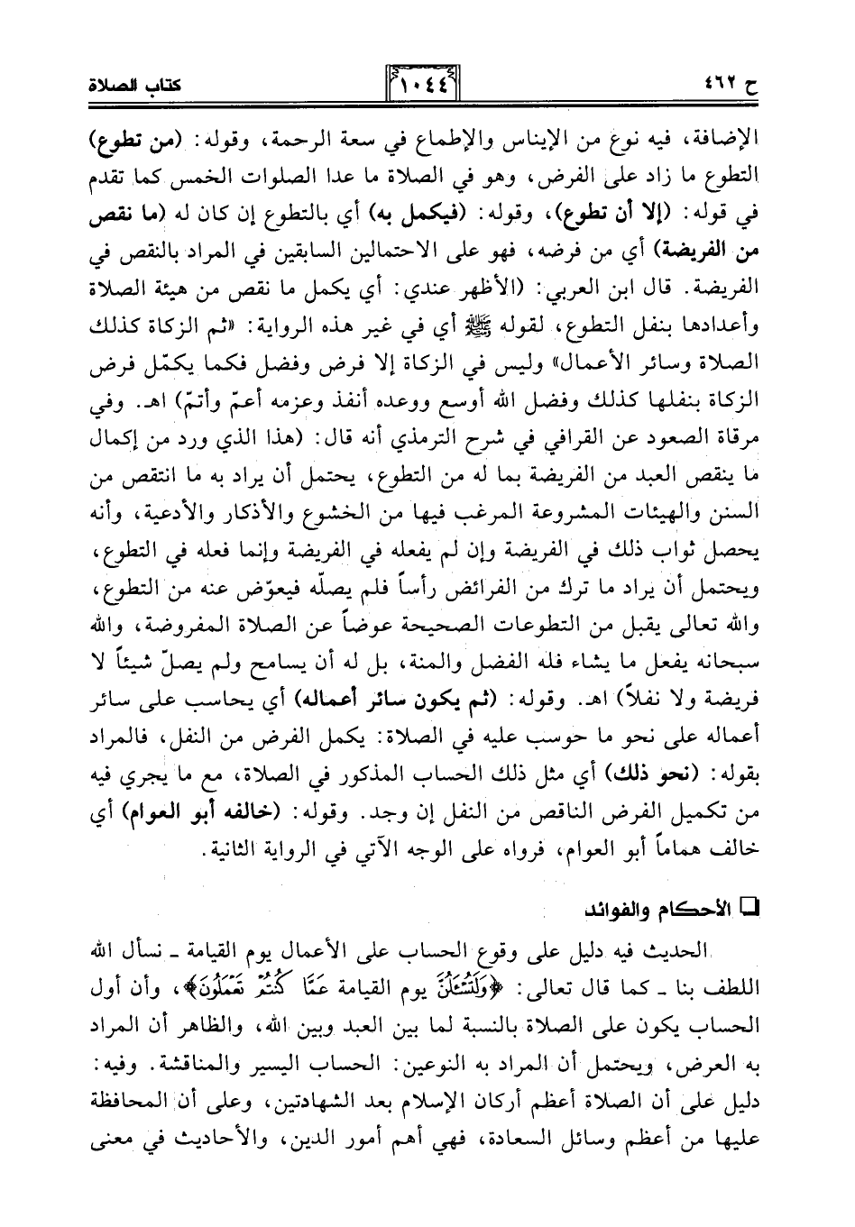 الإضافة، فيه نوع من الإيناس والإطماع في سعة الرحمة، وقوله: (من تطوع) التطوع ما زاد على الفرض، وهو في الصلاة ما عدا الصلوات الخمس كما تقدم في قوله: (إلا أن تطوع)، وقوله: (فيكمل به) أي بالتطوع إن كان له (ما نقص من الفريضة) أي من فرضه، فهو على الإحتمالين السابقين في المراد بالنقص في الفريضة. قال ابن العربي: (الأظهر عندي: أي يكمل ما نقص من هيئة الصلاة وأعدادها بنفل التطوع، لقوله - صلى الله عليه وسلم - أي في غير هذه الرواية: "ثم الزكاة كذلك الصلاة وسائر الأعمال" وليس في الزكاة إلا فرض وفضل فكما يكمل فرض الزكاة بنفلها كذلك وفضل الله أوسع ووعده أنفذ وعزمه أعمّ وأتمّ) اهـ. وفي مرقاة الصعود عن القرافي في شرح الترمذي أنه قال: (هذا الذي ورد من إكمال ما ينقص العبد من الفريضة بما له من التطوع، يحتمل أن يراد به ما انتقص من السنن والهيئات المشروعة المرغب فيها من الخشوع والأذكار والأدعية، وأنه يحصل ثواب ذلك في الفريضة وإن لم يفعله في الفريضة وإنما فعله في التطوع، ويحتمل أن يراد ما ترك من الفرائض رأسًا فلم يصلّه فيعوّض عنه من التطوع، والله تعالى يقبل من التطوعات الصحيحة عوضًا عن الصلاة المفروضة، والله سبحانه يفعل ما يشاء فله الفضل والمنة، بل له أن يسامح ولم يصلّ شيئًا لا فريضة ولا نفلًا) اهـ. وقوله: (ثم يكون سائر أعماله) أي يحاسب على سائر أعماله على نحو ما حوسب عليه في الصلاة: يكمل الفرض من النفل، فالمراد بقوله: (نحو ذلك) أي مثل ذلك الحساب المذكور في الصلاة، مع ما يجري فيه من تكميل الفرض الناقص من النفل إن وجد. وقوله: (خالفه أبو العوام) أي خالف همامًا أبو العوام، فرواه على الوجه الآتي في الرواية الثانية.