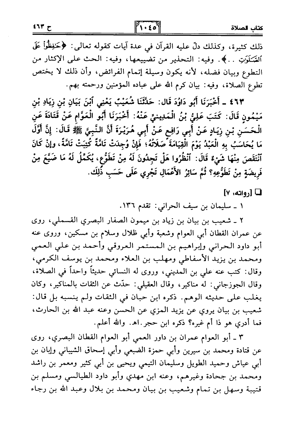 463 - أَخْبَرَنَا أَبُو دَاوُدَ قَالَ: حَدَّثَنَا شُعَيْبٌ يَعْنِي ابْنَ زِيَادِ بْنِ مَيْمُونٍ قَالَ: كَتَبَ عَلِيُّ بْنُ الْمَدِينِيِّ عَنْهُ: أَخْبَرَنَا أَبُو الْعَوَّامِ عَنْ قَتَادَةَ عَنِ الْحَسَنِ بن زياد عَنْ أَبِي رَافِعٍ عَنْ أَبِي هُرَيْرَةَ أَنَّ النَّبِيَّ - صلى الله عليه وسلم - قَالَ: إِنَّ أَوَّلَ مَا يُحَاسَبُ بِهِ الْعَبْدُ يَوْمَ الْقِيَامَةِ صَلَاتُهُ؛ فَإِنْ وُجِدَتْ تَامَّةً كُتِبَتْ تَامَّةً، وَإِنْ كَانَ انْتَقَصَ مِنْهَا شَيْءٌ قَالَ: انْظُرُوا هَلْ تَجِدُونَ لَهُ مِنْ تَطَوُّعٍ، يُكَمِّلُ لَهُ مَا ضَيَّعَ مِنْ فَرِيضَةٍ مِنْ تَطَوُّعِهِ؟ ثُمَّ سَائِرُ الأَعْمَالِ تَجْرِي عَلَى حَسَبِ ذَلِكَ.