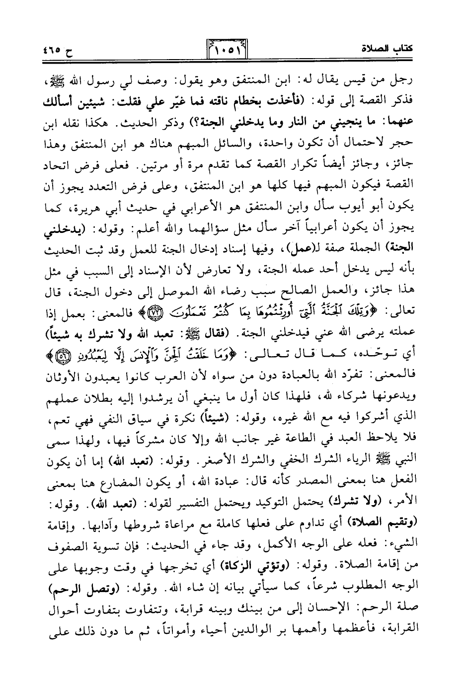 رجل من قيس يقال له: ابن المنتفق وهو يقول: وصف لي رسول الله - صلى الله عليه وسلم -، فذكر القصة إلى قوله: (فأخذت بخطام ناقته فما غيّر علي فقلت: شيئين أسألك عنهما: ما ينجيني من النار وما يدخلني الجنة؟ ) وذكر الحديث. هكذا نقله ابن حجر لاحتمال أن تكون واحدة، والسائل المبهم هناك هو ابن المنتفق وهذا جائز، وجائز أيضًا تكرار القصة كما تقدم مرة أو مرتين. فعلى فرض اتحاد القصة فيكون المبهم فيها كلها هو ابن المنتفق، وعلى فرض التعدد يجوز أن يكون أبو أيوب سأل وابن المنتفق هو الأعرابي في حديث أبي هريرة، كما يجوز أن يكون أعرابيًا آخر سأل مثل سؤالهما والله أعلم: وقوله: (يدخلني الجنة) الجملة صفة لـ (عمل)، وفيها إسناد إدخال الجنة للعمل وقد ثبت الحديث بأنه ليس يدخل أحد عمله الجنة، ولا تعارض لأن الإسناد إلى السبب في مثل هذا جائز، والعمل الصالح سبب رضاء الله الموصل إلى دخول الجنة، قال تعالى: {وَتِلْكَ الْجَنَّةُ الَّتِي أُورِثْتُمُوهَا بِمَا كُنْتُمْ تَعْمَلُونَ (72)} فالمعنى: بعمل إذا عملته يرضي الله عني فيدخلني الجنة. (فقال - صلى الله عليه وسلم -: تعبد الله ولا تشرك به شيئًا) أي توحّده، كما قال تعالى: {وَمَا خَلَقْتُ الْجِنَّ وَالْإِنْسَ إِلَّا لِيَعْبُدُونِ (56)} فالمعنى: تفرّد الله بالعبادة دون من سواه لأن العرب كانوا يعبدون الأوثان ويدعونها شركاء لله، فلهذا كان أول ما ينبغي أن يرشدوا إليه بطلان عملهم الذي أشركوا فيه مع الله غيره، وقوله: (شيئًا) نكرة في سياق النفي فهي تعم، فلا يلاحظ العبد في الطاعة غير جانب الله وإلا كان مشركًا فيها، ولهذا سمى النبي - صلى الله عليه وسلم - الرياء الشرك الخفي والشرك الأصغر. وقوله: (تعبد الله) إما أن يكون الفعل هنا بمعنى المصدر كأنه قال: عبادة الله، أو يكون المضارع هنا بمعنى الأمر، (ولا تشرك) يحتمل التوكيد ويحتمل التفسير لقوله: (تعبد الله). وقوله: (وتقيم الصلاة) أي تداوم على فعلها كاملة مع مراعاة شروطها وآدابها. وإقامة الشيء: فعله على الوجه الأكمل، وقد جاء في الحديث: فإن تسوية الصفوف من إقامة الصلاة. وقوله: (وتؤتي الزكاة) أي تخرجها في وقت وجوبها على الوجه المطلوب شرعًا، كما سيأتي بيانه إن شاء الله. وقوله: (وتصل الرحم) صلة الرحم: الإحسان إلى من بينك وبينه قرابة، وتتفاوت بتفاوت أحوال القرابة، فأعظمها وأهمها بر الوالدين أحياء وأمواتًا، ثم ما دون ذلك على