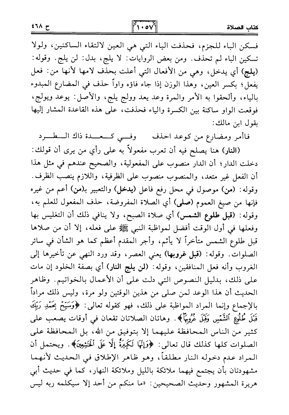(النار) هنا يصلح فيه أن تعرب مفعولًا به على رأي من يرى أن قولك: دخلت الدار؛ أن الدار منصوب على المفعولية، والصحيح عندهم في مثل هذا أن الفعل غير متعد، والمنصوب منصوب على الظرفية، واللازم ينصب الظرف. وقوله: (من) موصول في محل رفع فاعل (يدخل) والتعبير بـ (من) أعم من غيره فإنها من صيغ العموم (صلى) أي الصلاة المفروضة، حذف المفعول للعلم به، وقوله: (قبل طلوع الشمس) أي صلاة الصبح، ولا ينافي ذلك أن التغليس بها وفعلها في أول الوقت أفضل لمواظبة النبي - صلى الله عليه وسلم - على فعله، إلا أن من صلاها قبل طلوع الشمس متأخرًا لا يأثم، وأجر المقدم أعظم كما هو الشأن في سائر الصلوات. وقوله: (قبل غروبها) يعني العصر، وقد ورد النهي عن تأخيرها إلى الغروب وأنه فعل المنافقين، وقوله: (لن يلج النار) أي بصفة الخلود إن مات على ذلك، بدليل النصوص التي دلت على أن الأعمال بالخواتيم. وظاهر الحديث أن هذا الوعد لمن صلى من هذين الوقتين ولو مرة، وليس ذلك مرادًا بالإجماع وإنما المراد المواظبة على ذلك، فهو كقوله تعالى: {وَسَبِّحْ بِحَمْدِ رَبِّكَ قَبْلَ طُلُوعِ الشَّمْسِ وَقَبْلَ غُرُوبِهَا}. وهاتان الصلاتان تقعان في أوقات يصعب على كثير من الناس المحافظة عليهما إلا بتوفيق من الله، بل المحافظة على الصلوات كلها كذلك قال تعالى: {وَإِنَّهَا لَكَبِيرَةٌ إِلَّا عَلَى الْخَاشِعِينَ}. ويحتمل أن المراد عدم دخوله النار مطلقًا، وهو ظاهر الإطلاق في الحديث لأنهما مشهودتان بأن يجتمع فيهما ملائكة بالليل وملائكة النهار، كما في حديث أبي هريرة المشهور وحديث الصحيحين: "ما منكم من أحد إلا سيكلمه ربه ليس