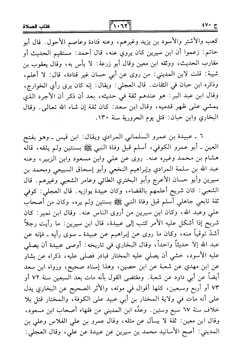 6 - عبيدة بن عمرو السلماني المرادي ويقال: ابن قيس -وهو بفتح العين- أبو عمرو الكوفي، أسلم قبل وفاة النبي - صلى الله عليه وسلم - بسنتين ولم يلقه، قاله هشام بن محمَّد وغيره عنه. روى عن علي وابن مسعود وابن الزبير، وعنه عبد الله بن سلمة المرادي وإبراهيم النخعي وأبو إسحاق السبيعي ومحمد بن سيرين وأبو حسان الأعرج وأبو البختري الطائي وعامر الشعبي وغيرهم. قال الشعبي: كان شريح أعلمهم بالقضاء، وكان عبيدة يوازيه. قال العجلي: كوفي ثقة تابعي جاهلي أسلم قبل وفاة النبي - صلى الله عليه وسلم - بسنتين ولم يره، وكان من أصحاب علي وعبد الله، وكان ابن سيرين من أروى الناس عنه. وقال ابن نمير: كان شريح إذا أشكل عليه الأمر كتب إلى عبيدة، قال ابن سيرين: ما رأيت رجلًا أشدّ توقيًا منه، وكان ما روى عن إبراهيم عن عبيدة -سوى رأيه- فإنه عن عبد الله إلا حديثًا واحدًا، وقال البخاري في تاريخه: أوصى عبيدة أن يصلي عليه الأسود، خشي أن يصلي عليه المختار فبادر فصلى عليه، ذكراه عن بشار عن ابن مهدي عن شعبة عن ابن حصين، وهذا إسناد صحيح، ورواه ابن سعد أيضًا عن أبي داود عن شعبة. ومقتضى القول بأنه مات بعد السبعين سنة 72 أو 73 أو أربع وسبعين، كلها أقوال في موته، والأثر الصحيح عن البخاري يدل على أنه مات في ولاية المختار بن أبي عبيد على الكوفة، والمختار قتل بلا خلاف سنة 67 سبع وستين. وعدَّه ابن المديني من فقهاء أصحاب ابن مسعود، وقال ابن معين: ثقة لا يسأل عن مثله، وقال عمرو بن علي الفلاس وعلي بن المديني: أصح الأسانيد محمَّد بن سيرين عن عبيدة عن علي، وقال العجلي: