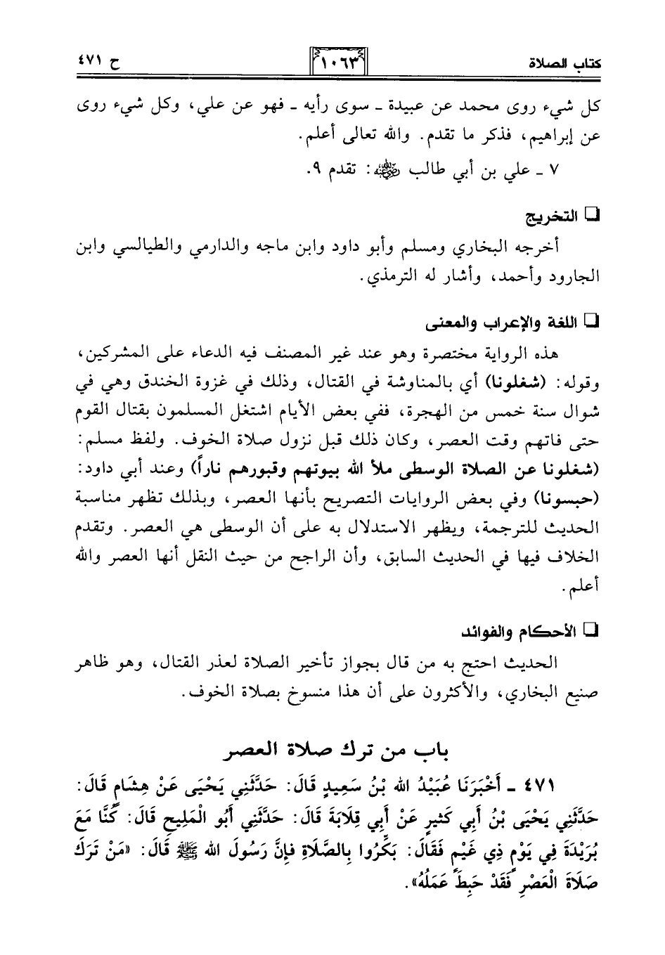 هذه الرواية مختصرة وهو عند غير المصنف فيه الدعاء على المشركين، وقوله: (شغلونا) أي بالمناوشة في القتال، وذلك في غزوة الخندق وهي في شوال سنة خمس من الهجرة، ففي بعض الأيام اشتغل المسلمون بقتال القوم حتى فاتهم وقت العصر، وكان ذلك قبل نزول صلاة الخوف. ولفظ مسلم: (شغلونا عن الصلاة الوسطى ملأ الله بيوتهم وقبورهم نارًا) وعند أبي داود: (حبسونا) وفي بعض الروايات التصريح بأنها العصر، وبذلك تظهر مناسبة الحديث للترجمة، ويظهر الإستدلال به على أن الوسطى هي العصر. وتقدم الخلاف فيها في الحديث السابق، وأن الراجح من حيث النقل أنها العصر والله أعلم.