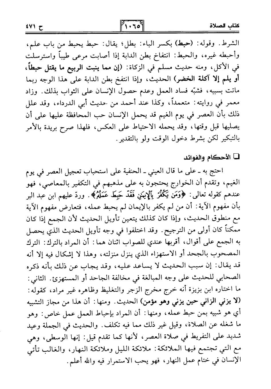 احتج به -على ما قال العيني- الحنفية على استحباب تعجيل العصر في يوم الغيم، وتقدم أن الخوارج يحتجون به على مذهبهم في التكفير بالمعاصي، فهو عندهم كقوله تعالى: {وَمَنْ يَكْفُرْ بِالْإِيمَانِ فَقَدْ حَبِطَ عَمَلُهُ}. ورد عليهم ابن عبد البر بأن مفهوم الآية: أن من لم يكفر بالإيمان لم يحبط عمله، فتعارض مفهوم الآية مع منطوق الحديث، وإذا كان كذلك يتعين تأويل الحديث لأن الجمع إذا كان ممكنًا كان أولى من الترجيح. وقد اختلفوا في وجه تأويل الحديث الذي يحصل به الجمع على أقوال، أقربها عندي للصواب اثنان هما: أن المراد بالترك: الترك المصحوب بالجحد أو الإستهزاء الذي ينزل منزلته، وهذا لا إشكال فيه إلا أنه قد يقال: إن سبب الحديث لا يساعد عليه، وقد يجاب عن ذلك بأنه ذكره الصحابي للحديث على وجه المبالغة في مخالفة الجاحد أو المستهزئ. الثاني: ما اختاره ابن بزيزة أنه خرج مخرج الزجر والتغليظ وظاهره غير مراد، كقوله: (لا يزني الزاني حين يزني وهو مؤمن) الحديث. ومنها: أن هذا من مجاز التشبيه أي هو شبيه بمن حبط عمله، ومنها: أن المراد بإحباط العمل عمل خاص: وهو ما شغله عن الصلاة، وقيل غير ذلك مما فيه تكلف. والحديث في الجملة وعيد شديد على التفريط في صلاة العصر؛ لأنها كما تقدم قيل: إنها الوسطى، وهي مع التي تجتمع فيها الملائكة: ملائكة الليل وملائكة النهار، والغالب تأتي الإنسان في ختام عمل النهار، فهو يحب الإستمرار فيه والله أعلم.