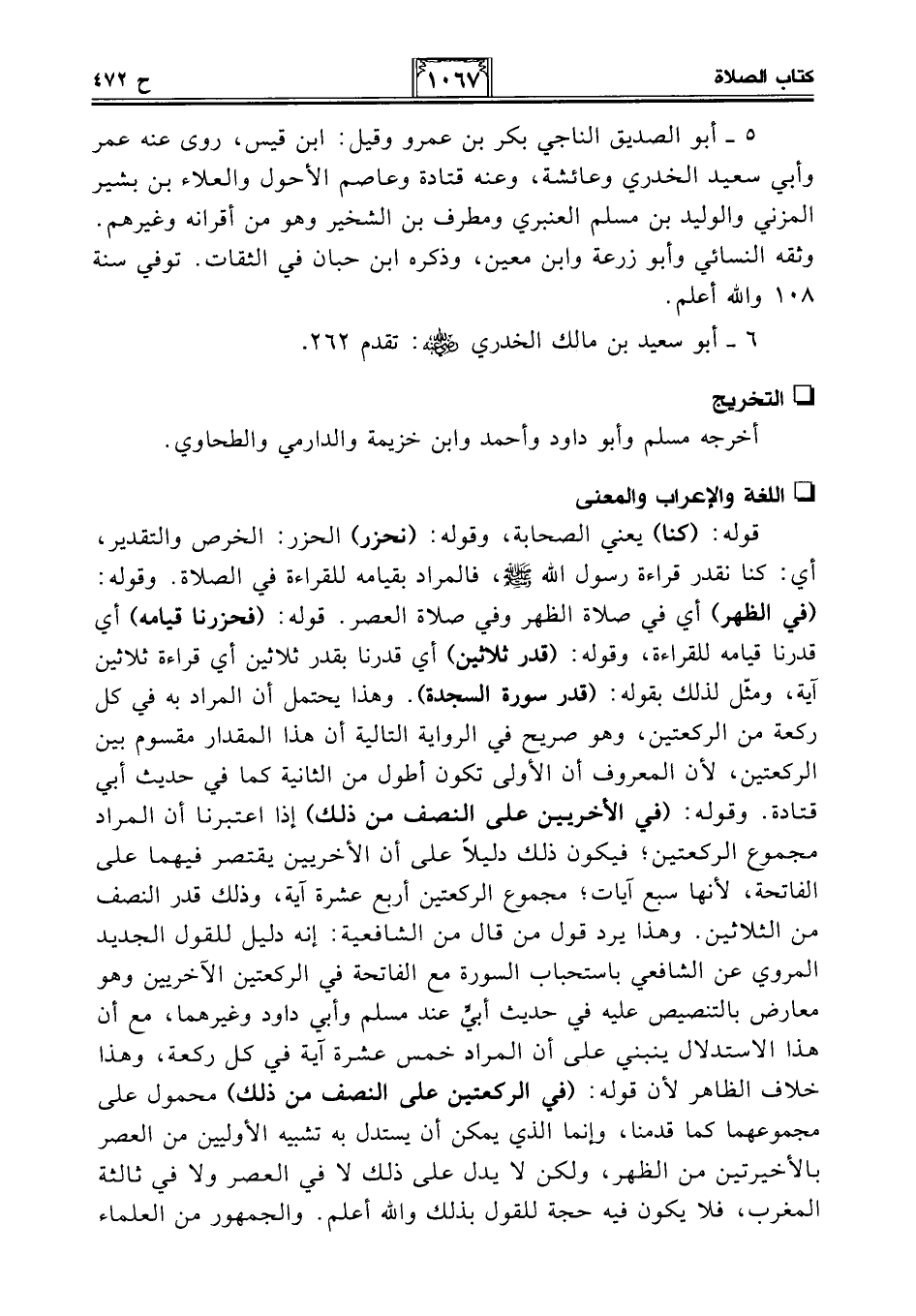 قوله: (كنا) يعني الصحابة، وقوله: (نحزر) الحزر: الخرص والتقدير، أي: كنا نقدر قراءة رسول الله - صلى الله عليه وسلم -، فالمراد بقيامه للقراءة في الصلاة. وقوله: (في الظهر) أي في صلاة الظهر وفي صلاة العصر. قوله: (فحزرنا قيامه) أي قدرنا قيامه للقراءة، وقوله: (قدر ثلاثين) أي قدرنا بقدر ثلاثين أي قراءة ثلاثين آية، ومثّل لذلك بقوله: (قدر سورة السجدة). وهذا يحتمل أن المراد به في كل ركعة من الركعتين، وهو صريح في الرواية التالية أن هذا المقدار مقسوم بين الركعتين، لأن المعروف أن الأولى تكون أطول من الثانية كما في حديث أبي قتادة. وقوله: (في الأخريين على النصف من ذلك) إذا اعتبرنا أن المراد مجموع الركعتين؛ فيكون ذلك دليلًا على أن الأخريين يقتصر فيهما على الفاتحة؛ لأنها سبع آيات؛ مجموع الركعتين أربع عشرة آية، وذلك قدر النصف من الثلاثين. وهذا يرد قول من قال من الشافعية: إنه دليل للقول الجديد المروي عن الشافعي باستحباب السورة مع الفاتحة في الركعتين الآخريين وهو معارض بالتنصيص عليه في حديث أبيِّ عند مسلم وأبي داود وغيرهما، مع أن هذا الإستدلال ينبني على أن المراد خمس عشرة آية في كل ركعة، وهذا خلاف الظاهر لأنّ قوله: (في الركعتين على النصف من ذلك) محمول على مجموعهما كما قدمنا، وإنما الذي يمكن أن يستدل به تشبيه الأوليين من العصر بالأخيرتين من الظهر، ولكن لا يدل على ذلك لا في العصر ولا في ثالثة المغرب، فلا يكون فيه حجة للقول بذلك والله أعلم. والجمهور من العلماء